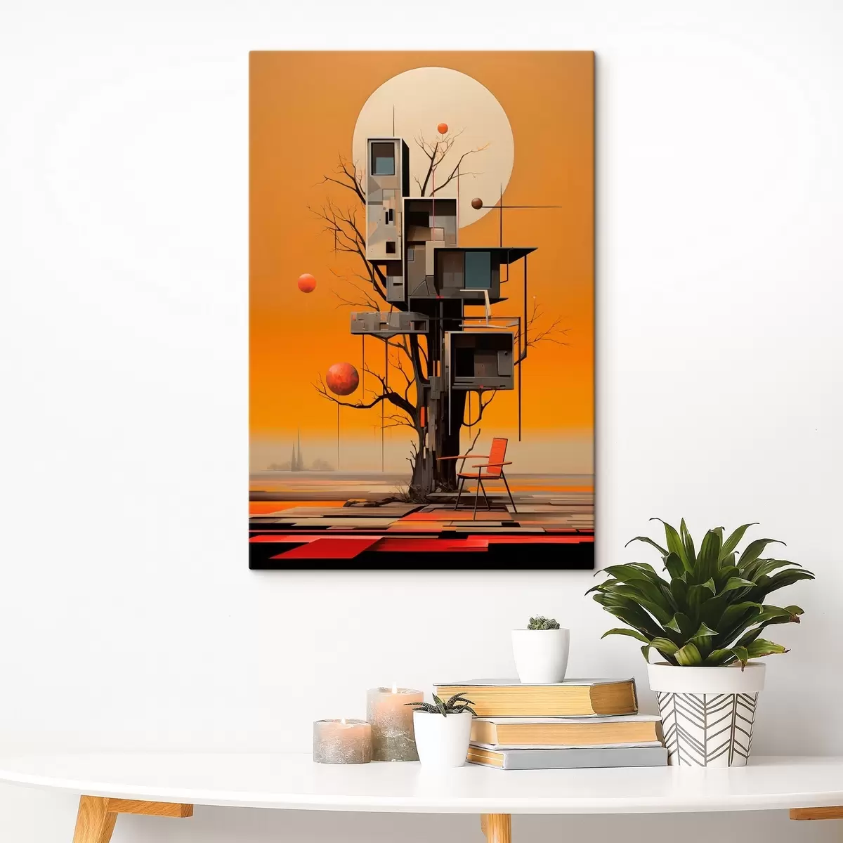 Peinture Cabane surréaliste dans les arbres sur fond orange Art. s46526