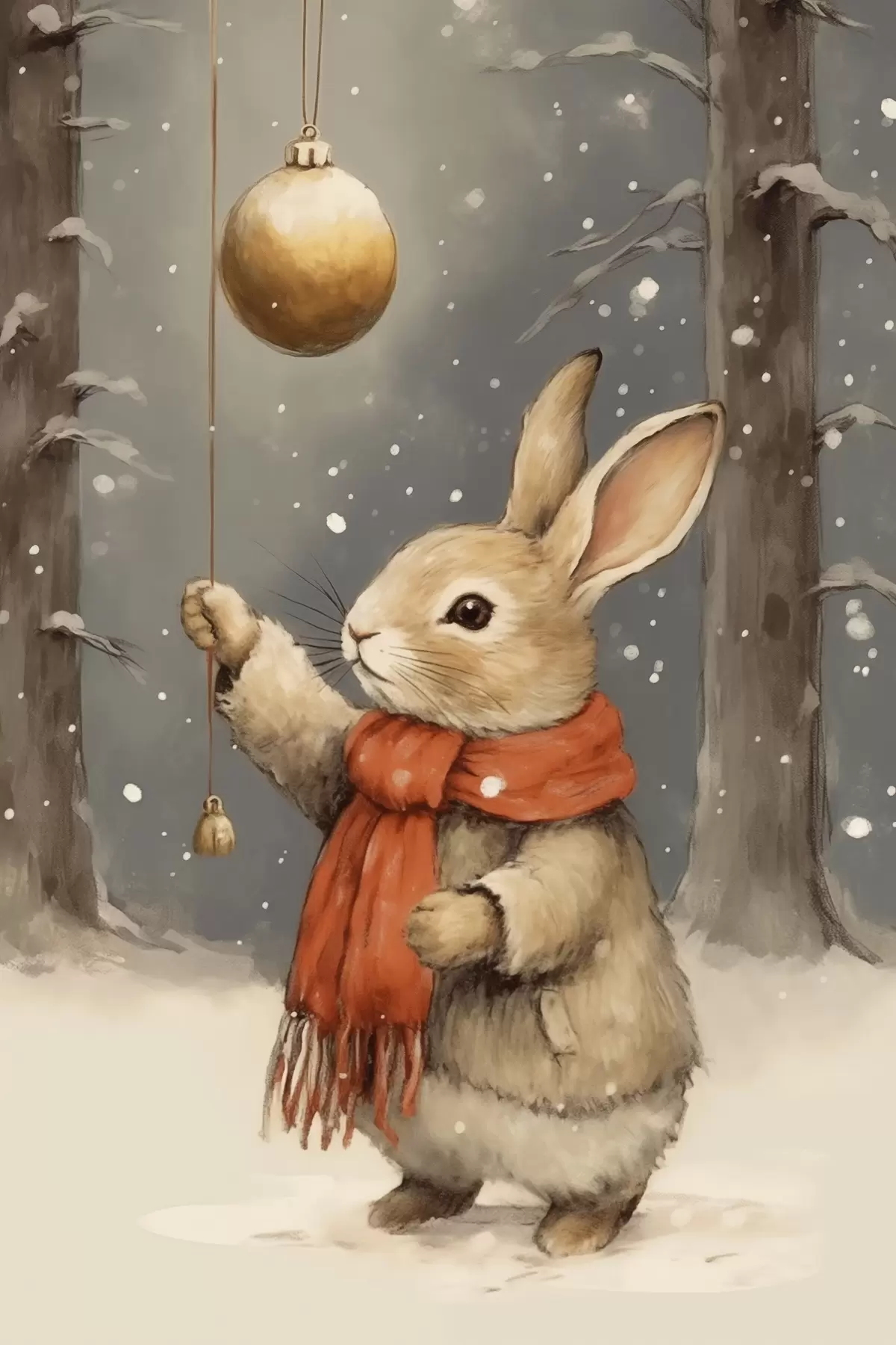 Peintures Lièvre d'hiver avec écharpe et boule de Noël s46619