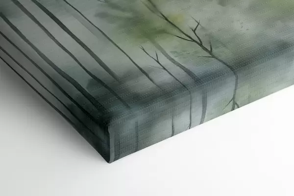 Peinture Imitation d'une aquarelle représentant une forêt brumeuse avec de grands pins et des montagnes en arrière-plan. Art. s46690