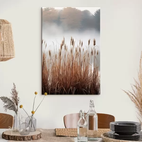 Peintures De grands roseaux poussant dans un plan d'eau, l'eau reflète les roseaux, arrière-plan brumeux, lumière douce, scène naturelle s46696