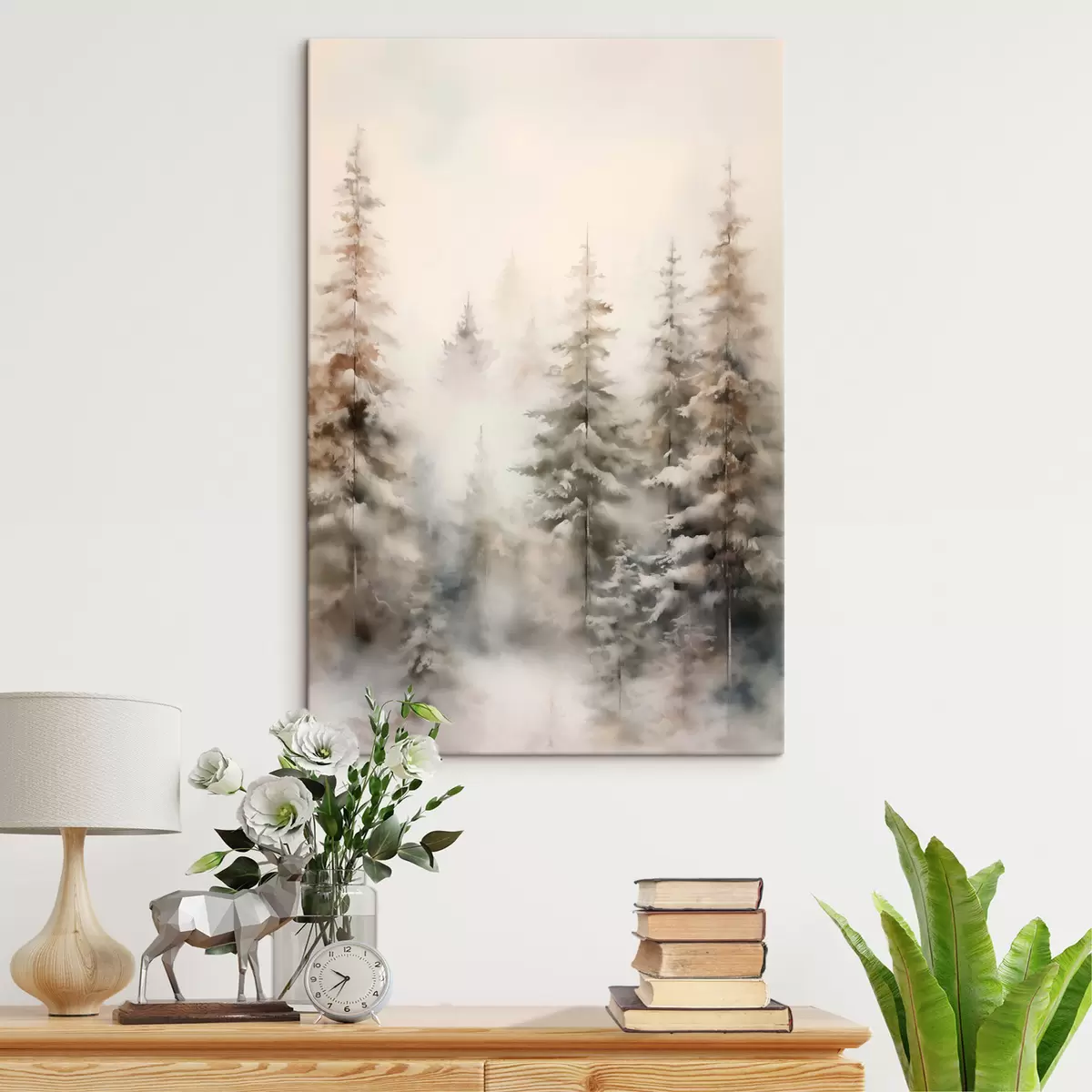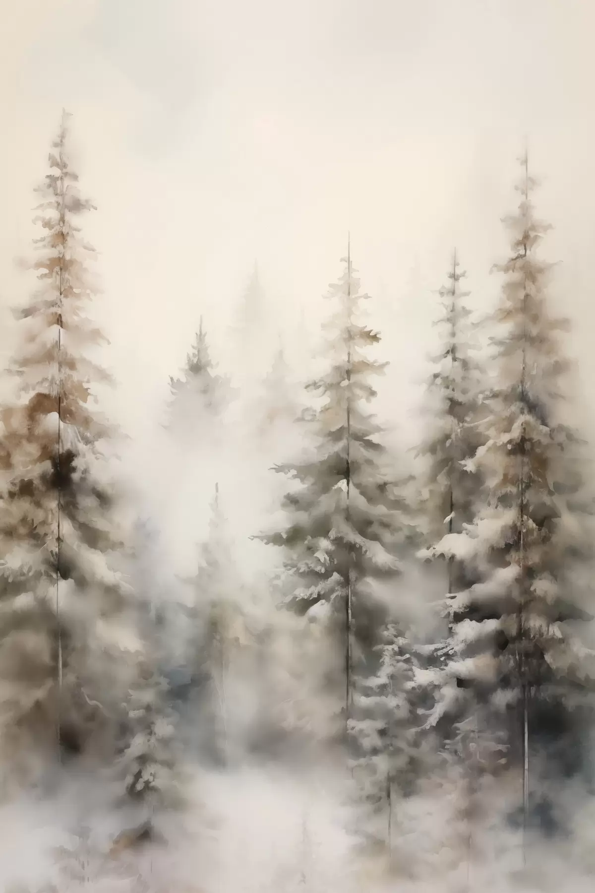 Peinture De grands pins recouverts de neige, dressés dans une forêt brumeuse, une scène hivernale douce et feutrée. Art. s46701