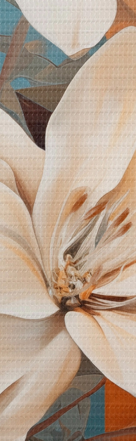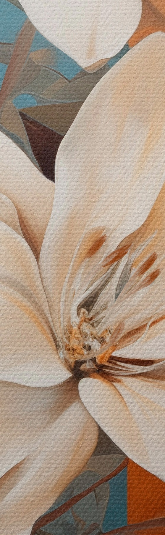 Peinture Fleurs et feuilles blanches abstraites sur fond brun et bleu avec des formes abstraites, dans un style minimaliste. Art. s46710