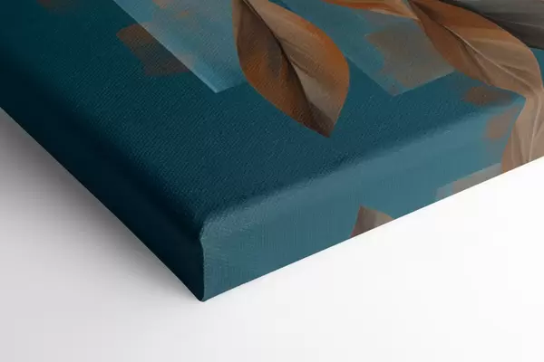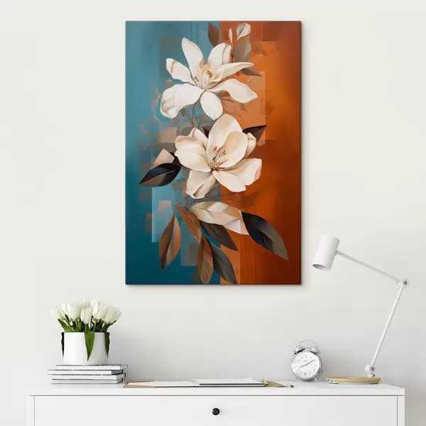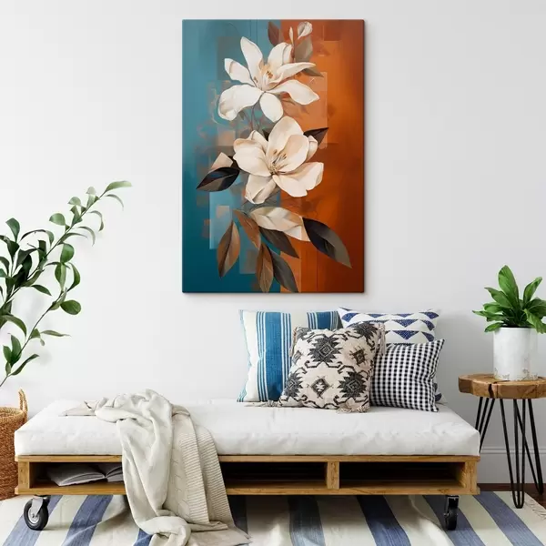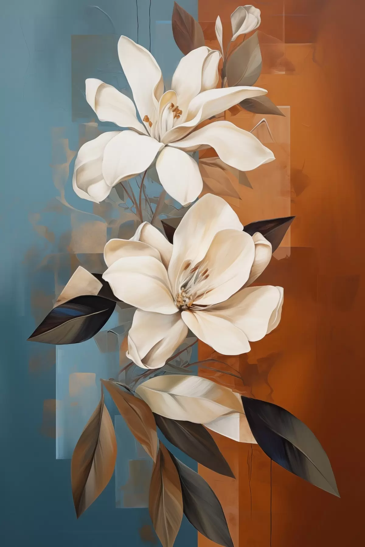 Peinture Fleurs et feuilles blanches abstraites sur fond brun et bleu avec des formes abstraites, dans un style minimaliste. Art. s46710