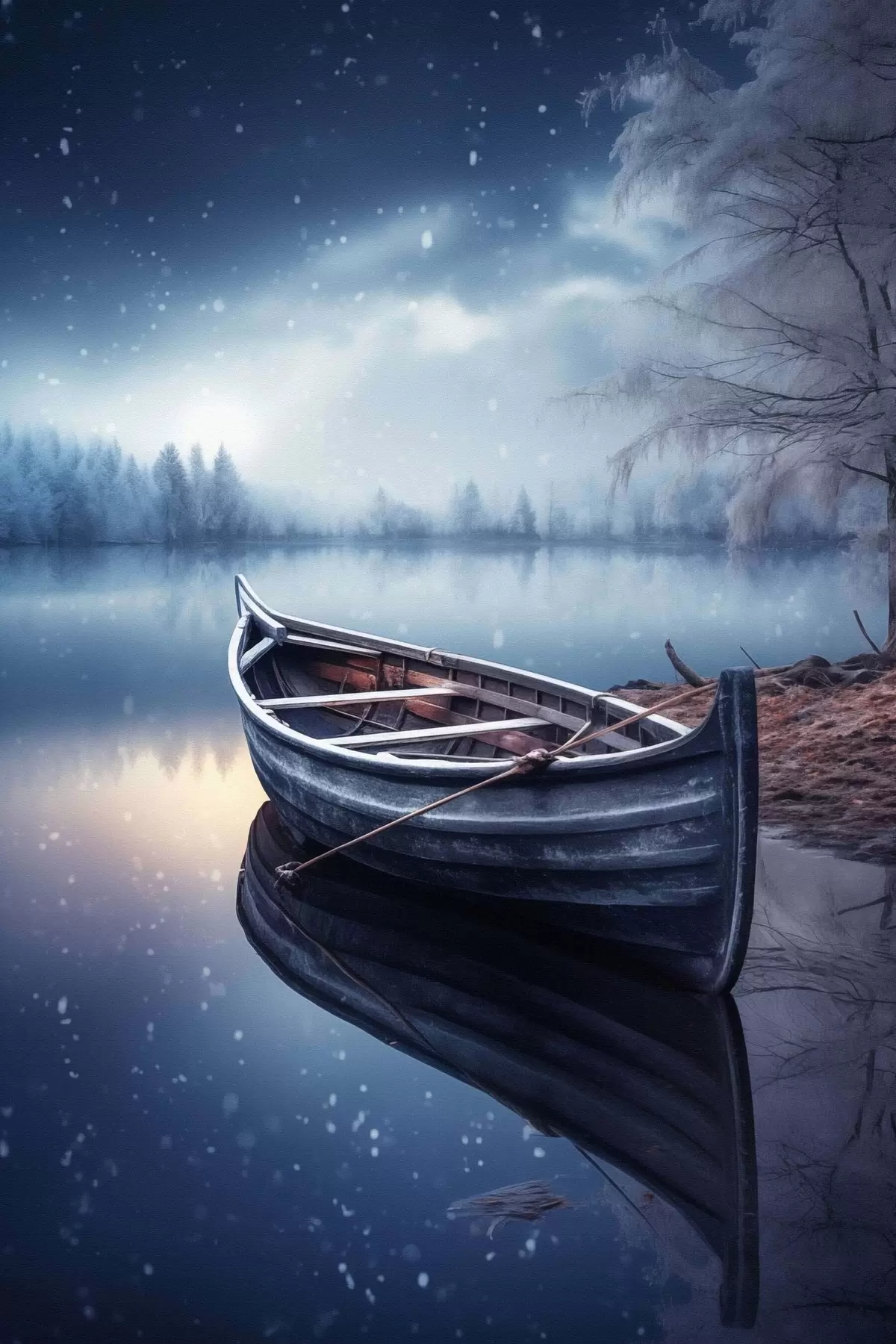 Peintures Bateau vide au bord d'un lac en hiver s46773