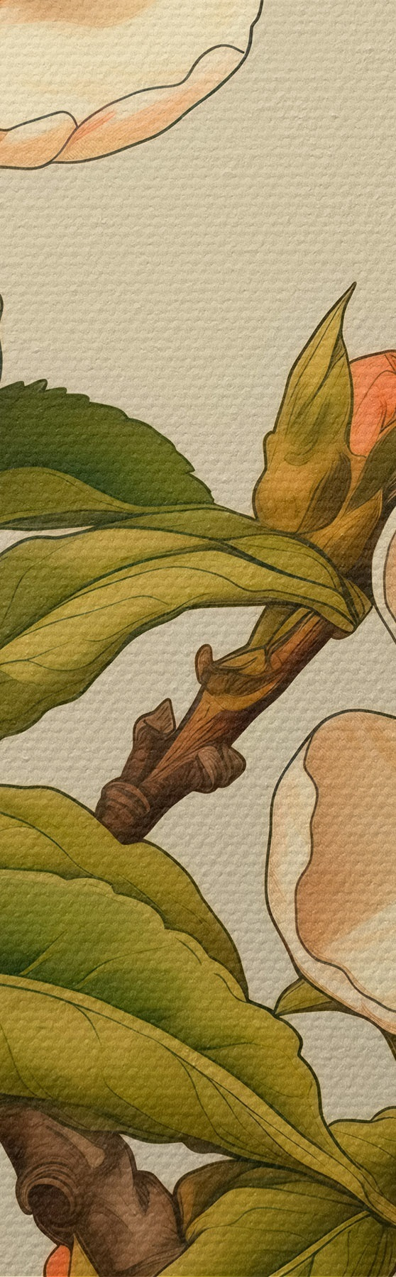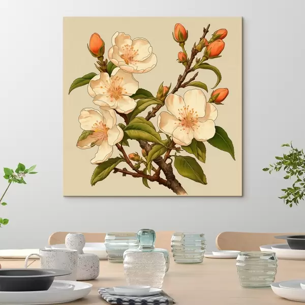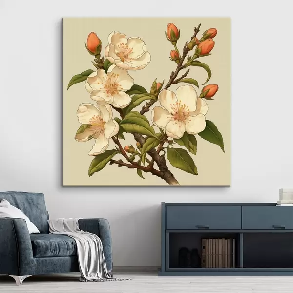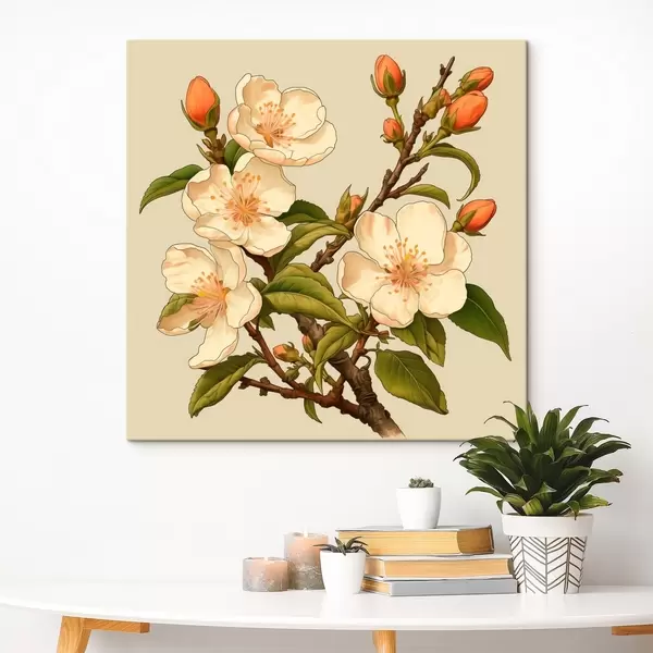 Peintures Branche fleurie avec des fleurs blanches sur fond beige dans le style d'une illustration classique s46923