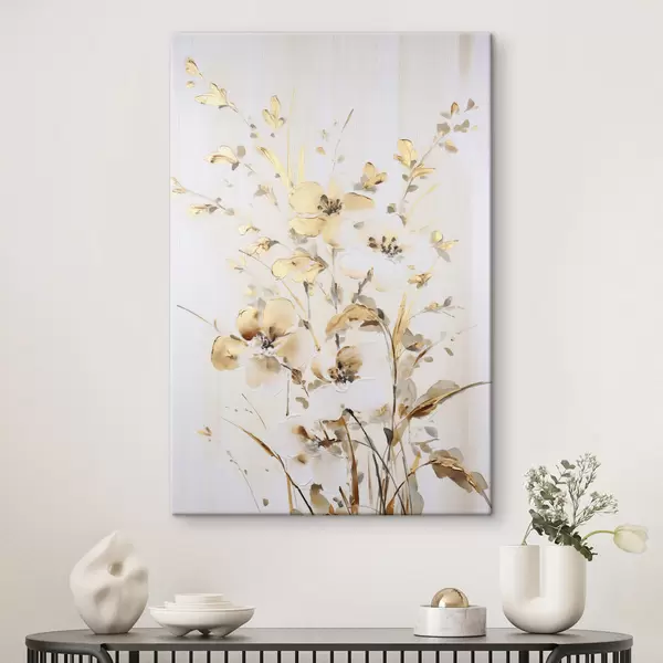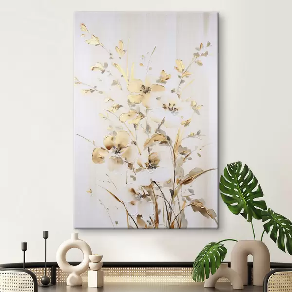 Peinture Fleurs et feuilles jaunes texturées sur fond blanc, avec des coups de pinceau délicats Art. s47017