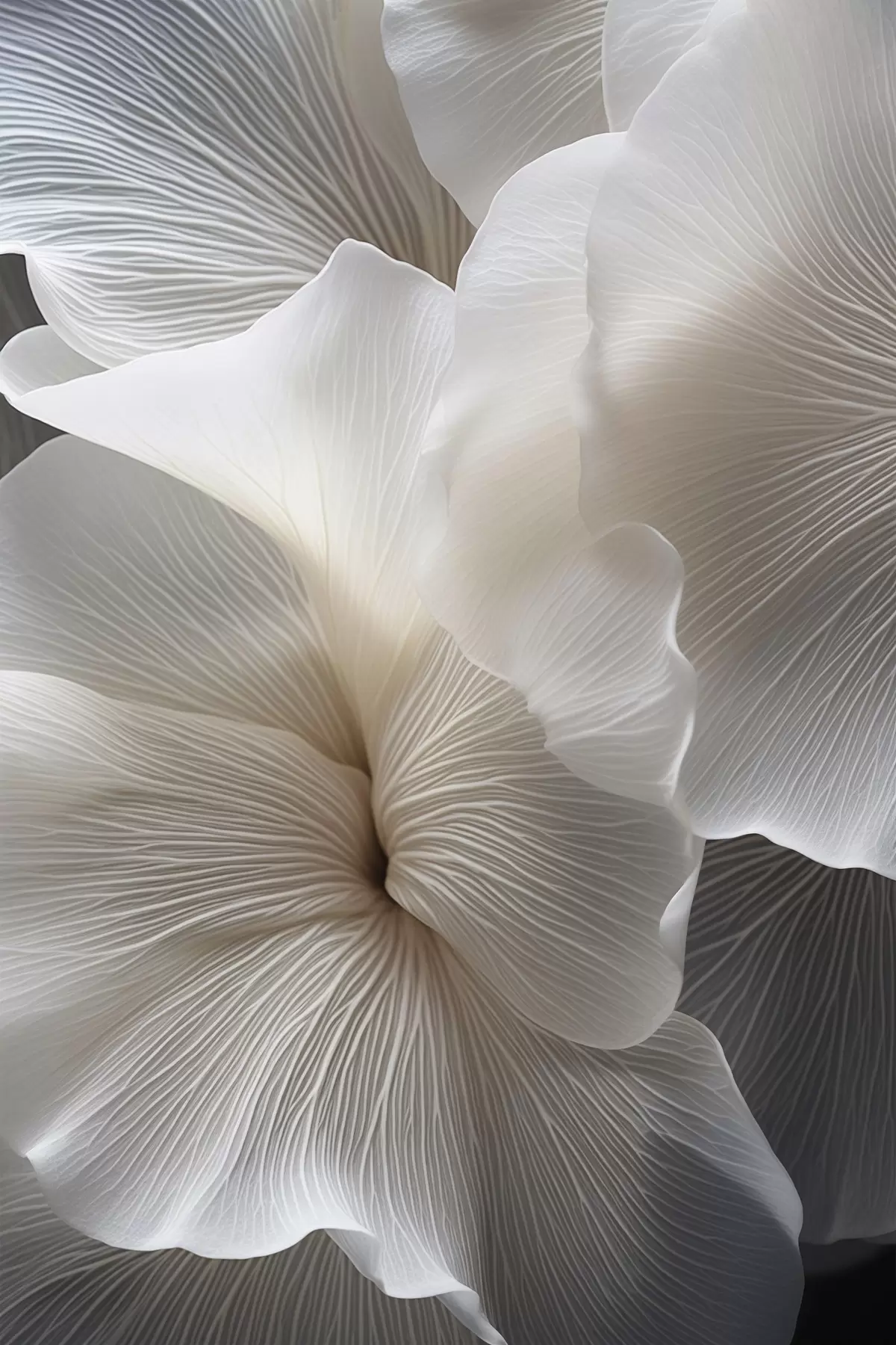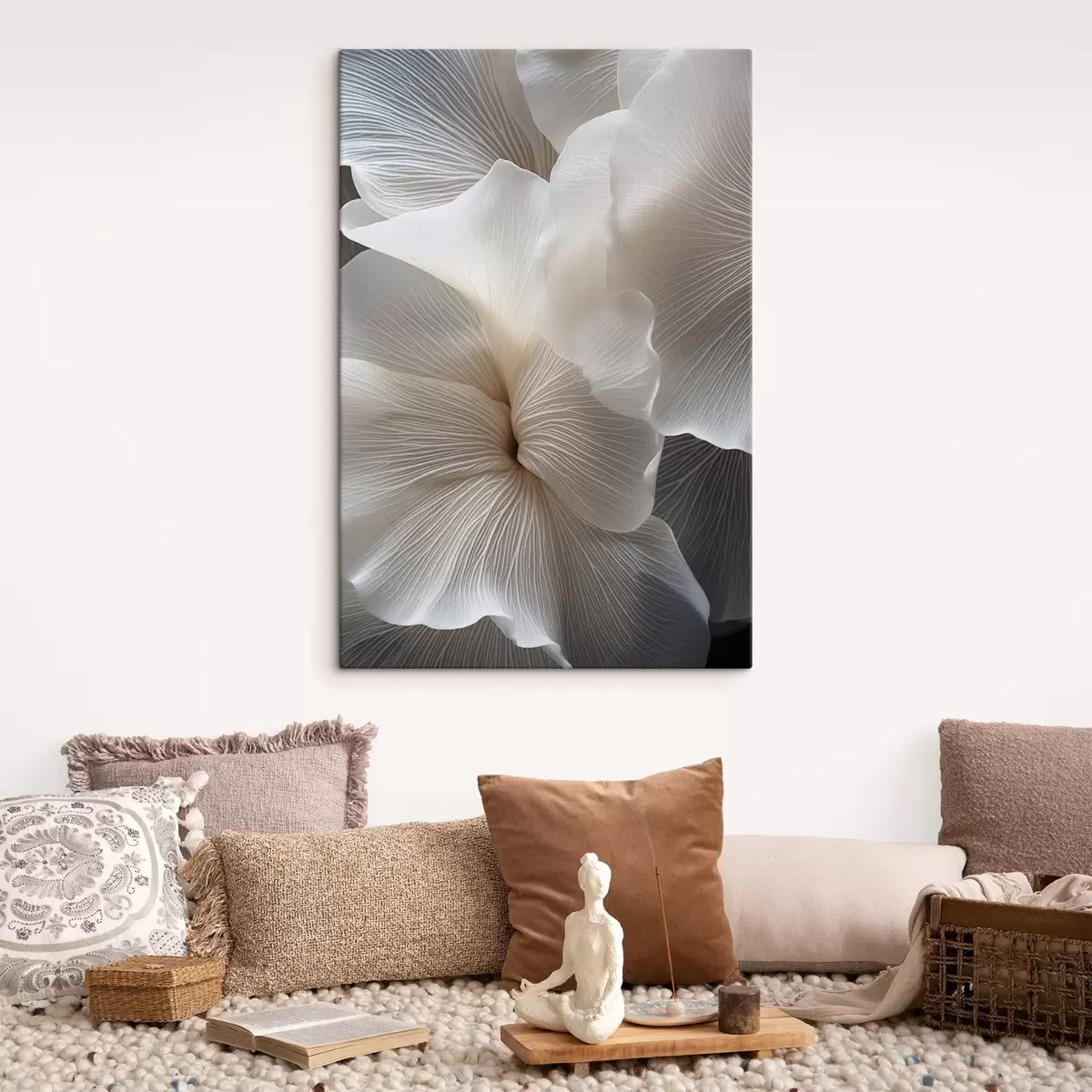 Peinture Gros plan sur de délicats pétales de fleurs blancs abstraits aux lignes complexes et au fond sombre flou Art. s47019