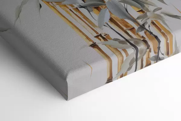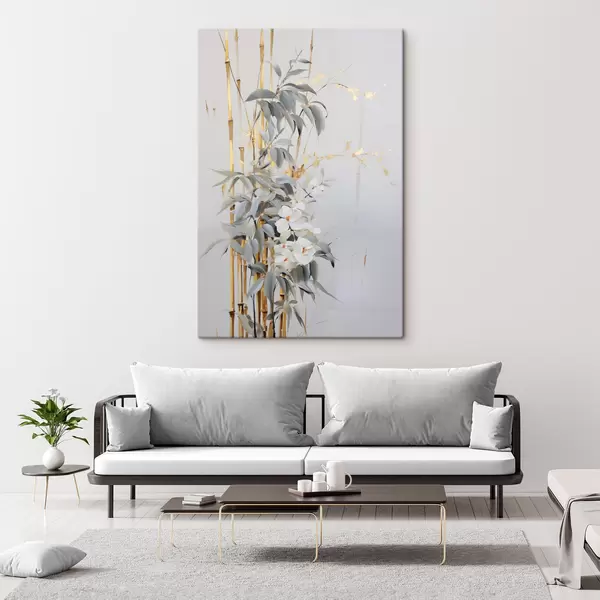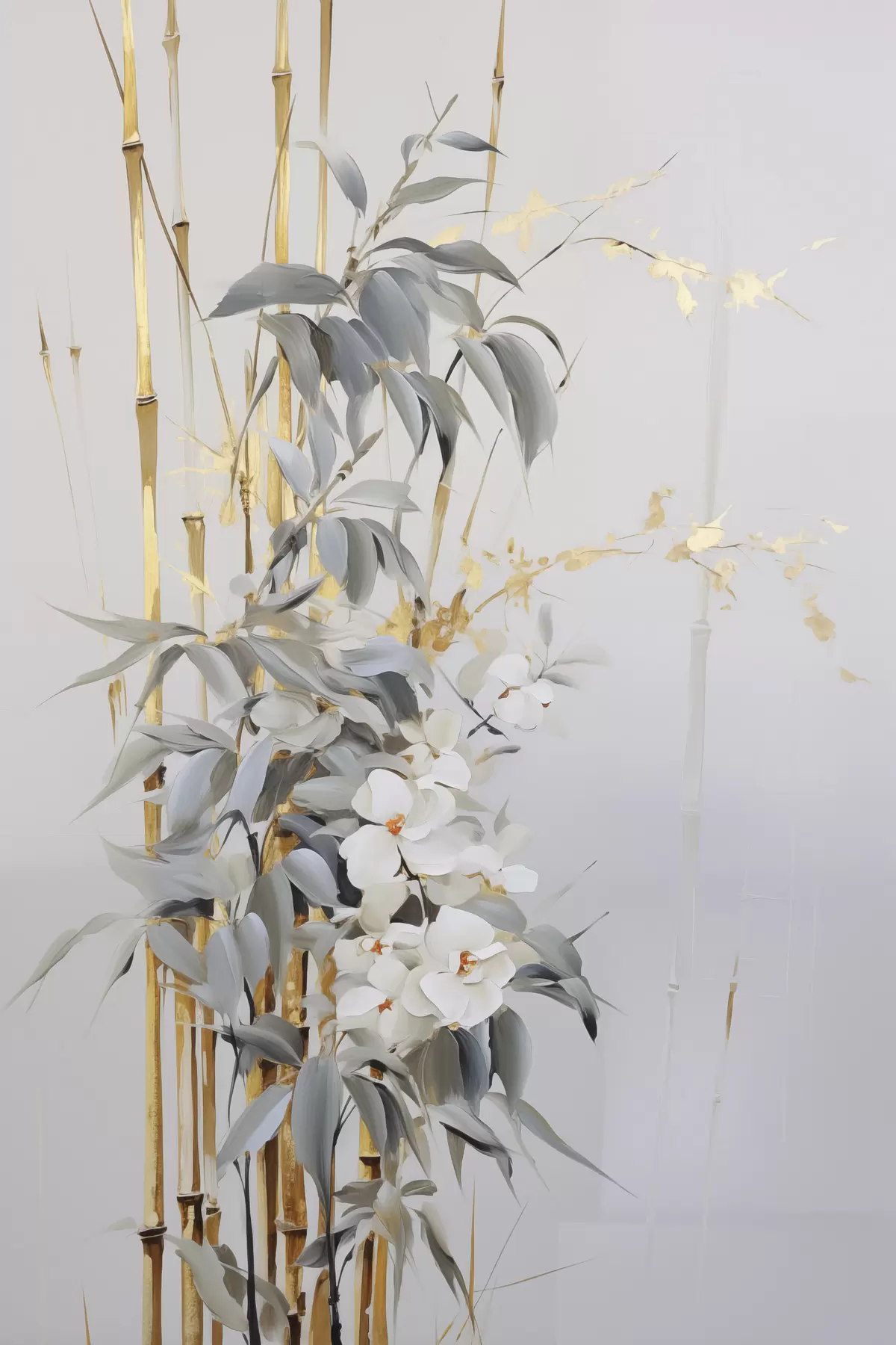Peinture Tiges de bambou abstraites avec des accents jaunes, des fleurs blanches délicates et des feuilles vert pâle, fond gris Art. s47038