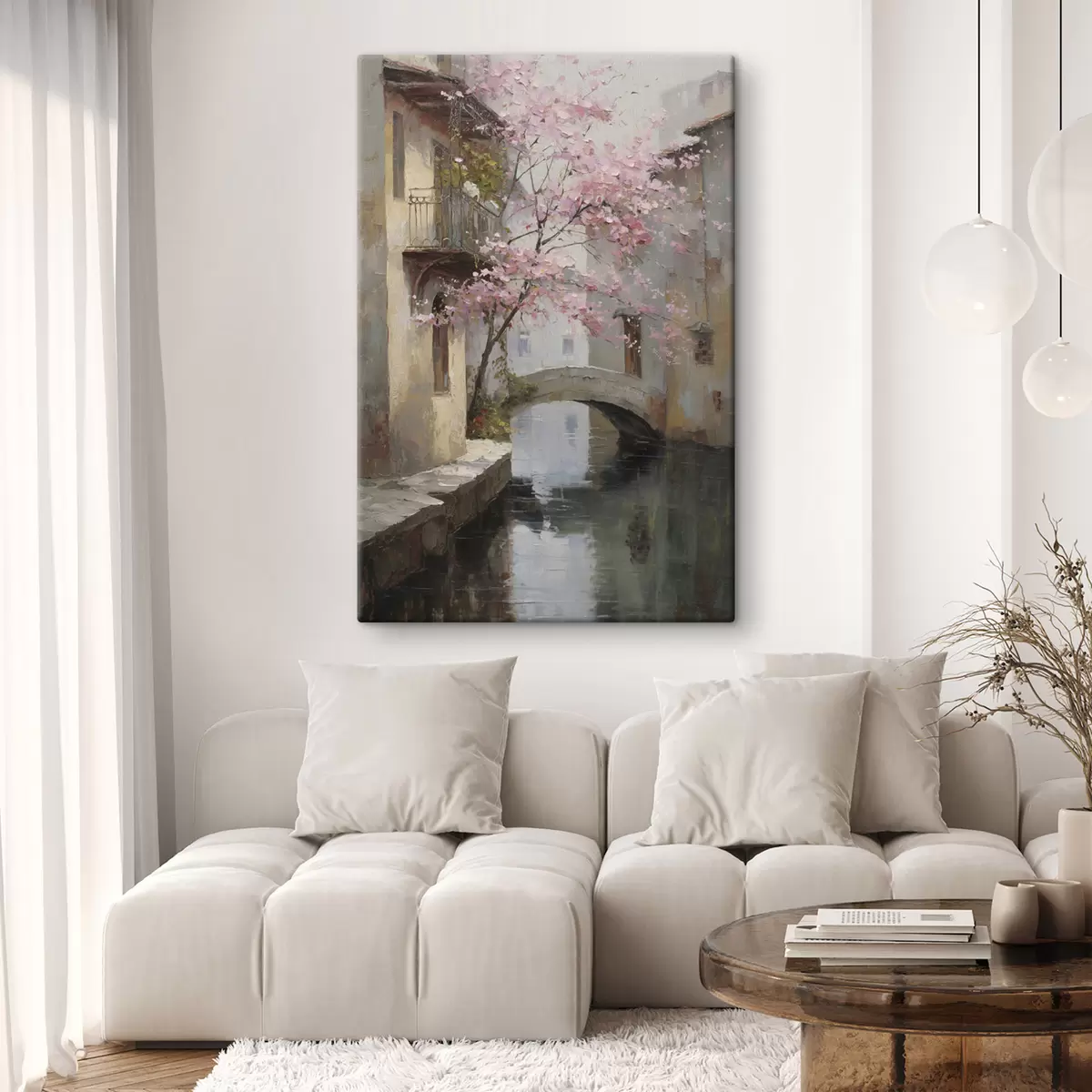 Peintures paysage urbain romantique avec un arbre en fleurs dans le style d'une peinture à l'huile s47126