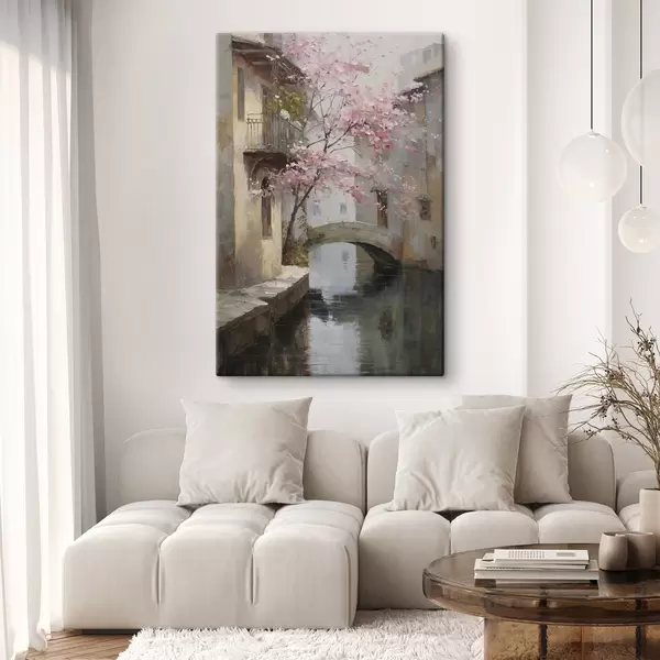 Peinture paysage urbain romantique avec un arbre en fleurs dans le style d'une peinture à l'huile Art. s47126