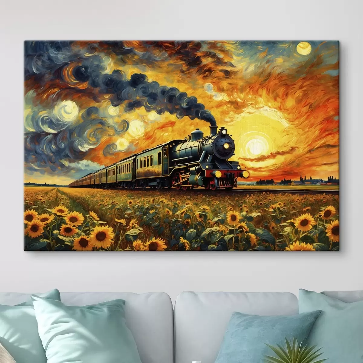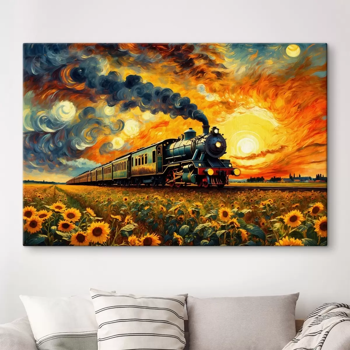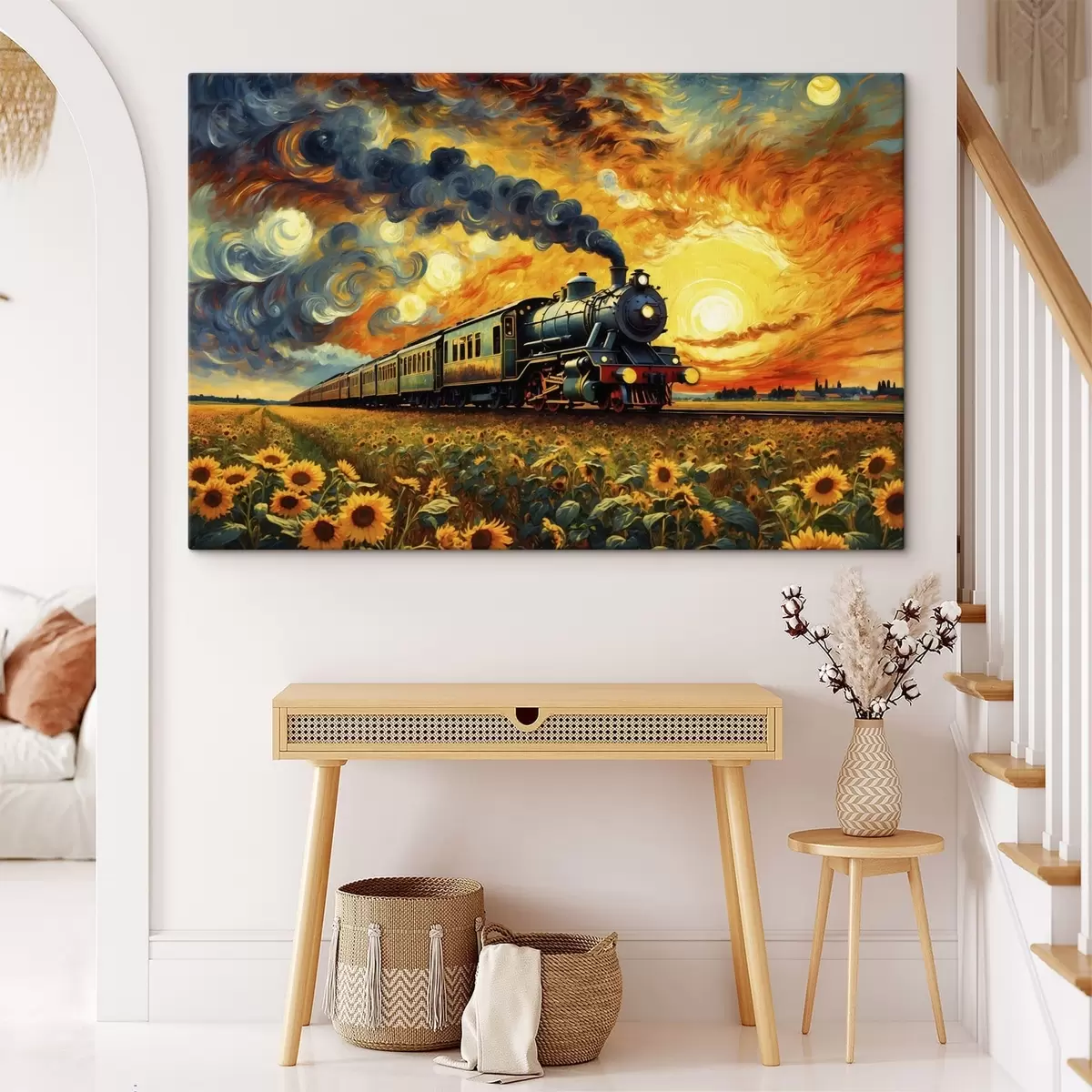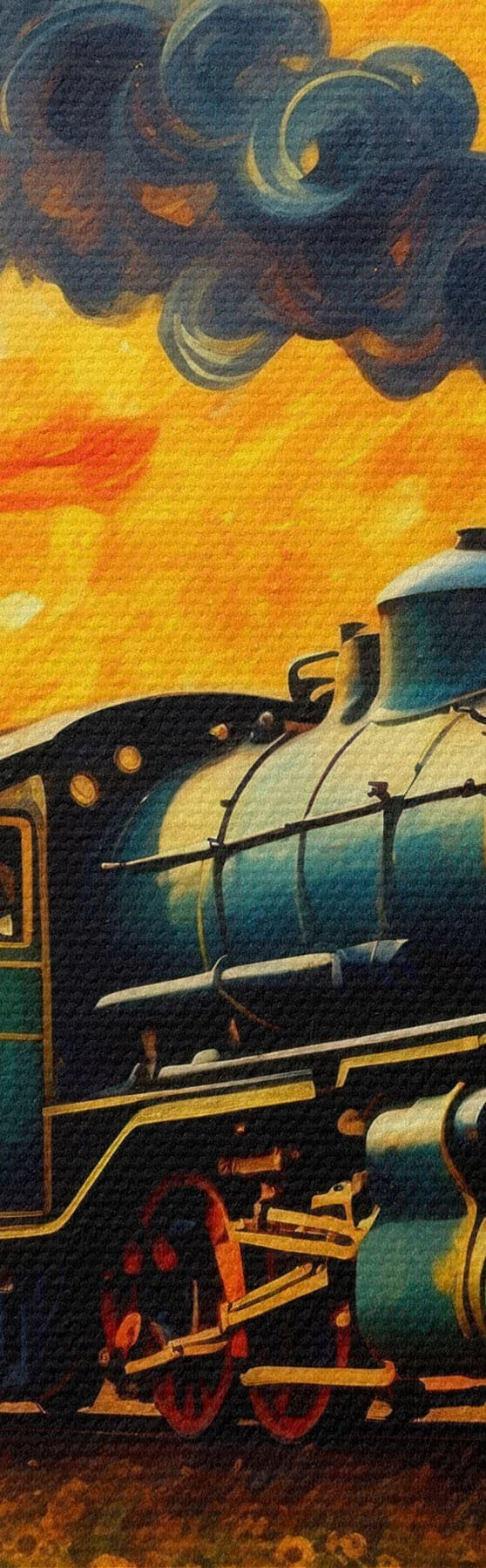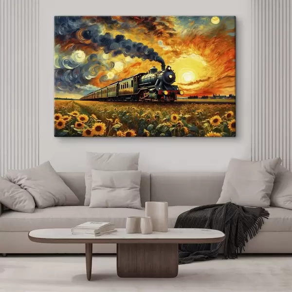 Peinture Train à vapeur dans un champ avec un ciel spectaculaire Art. s47257
