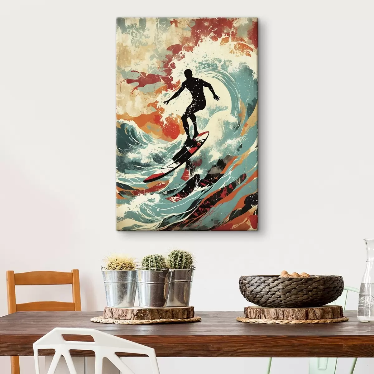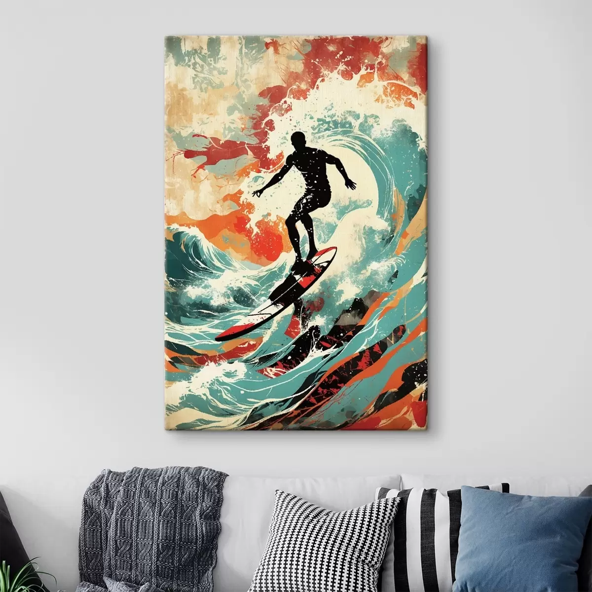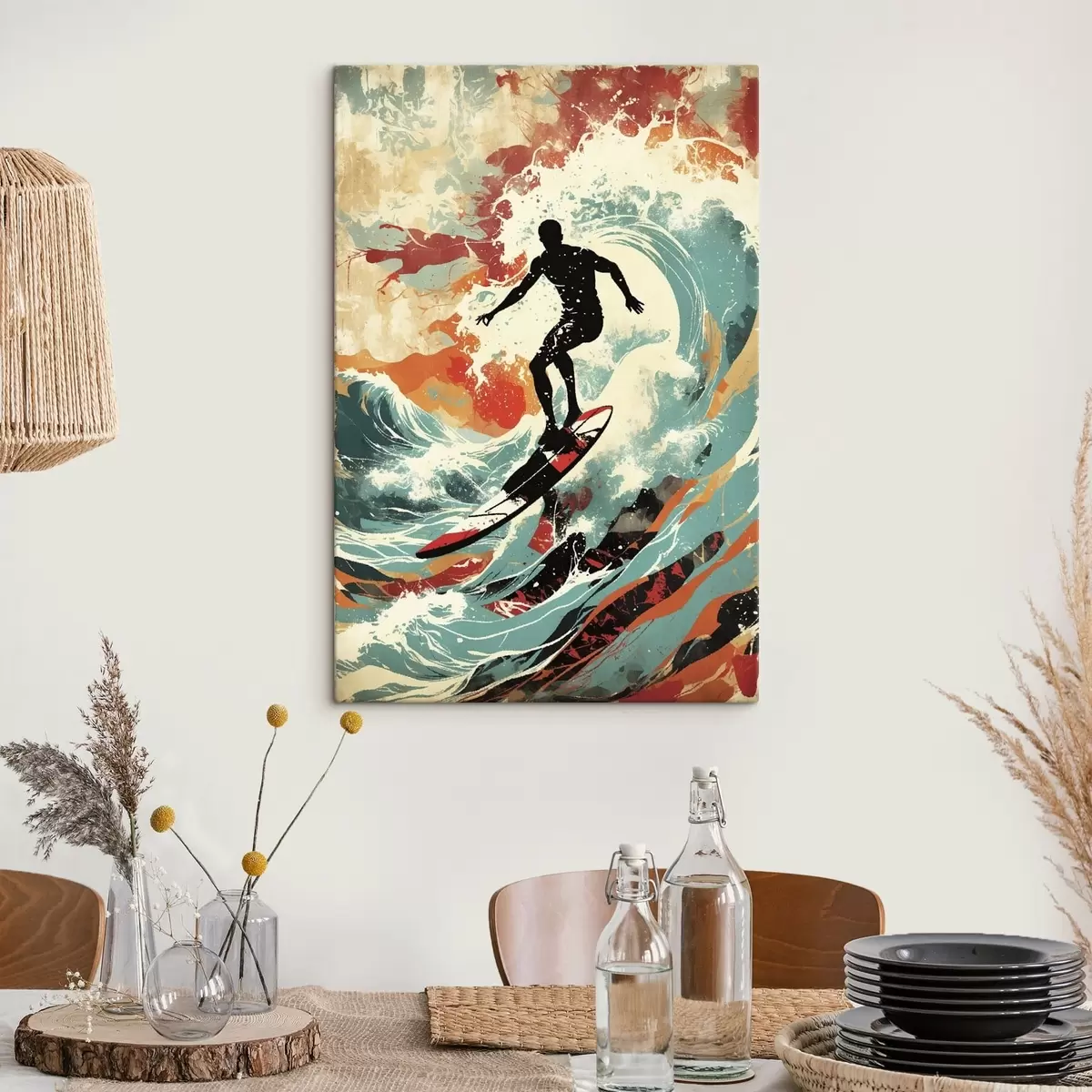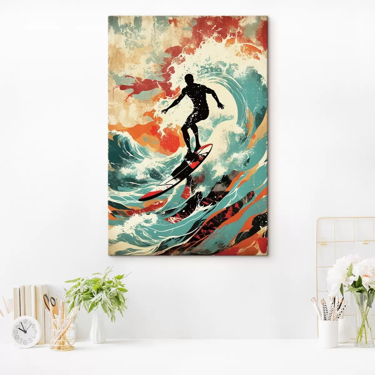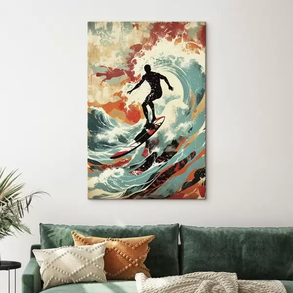 Peinture Silhouette d'un surfeur sur des vagues aux couleurs vives Art. s47284