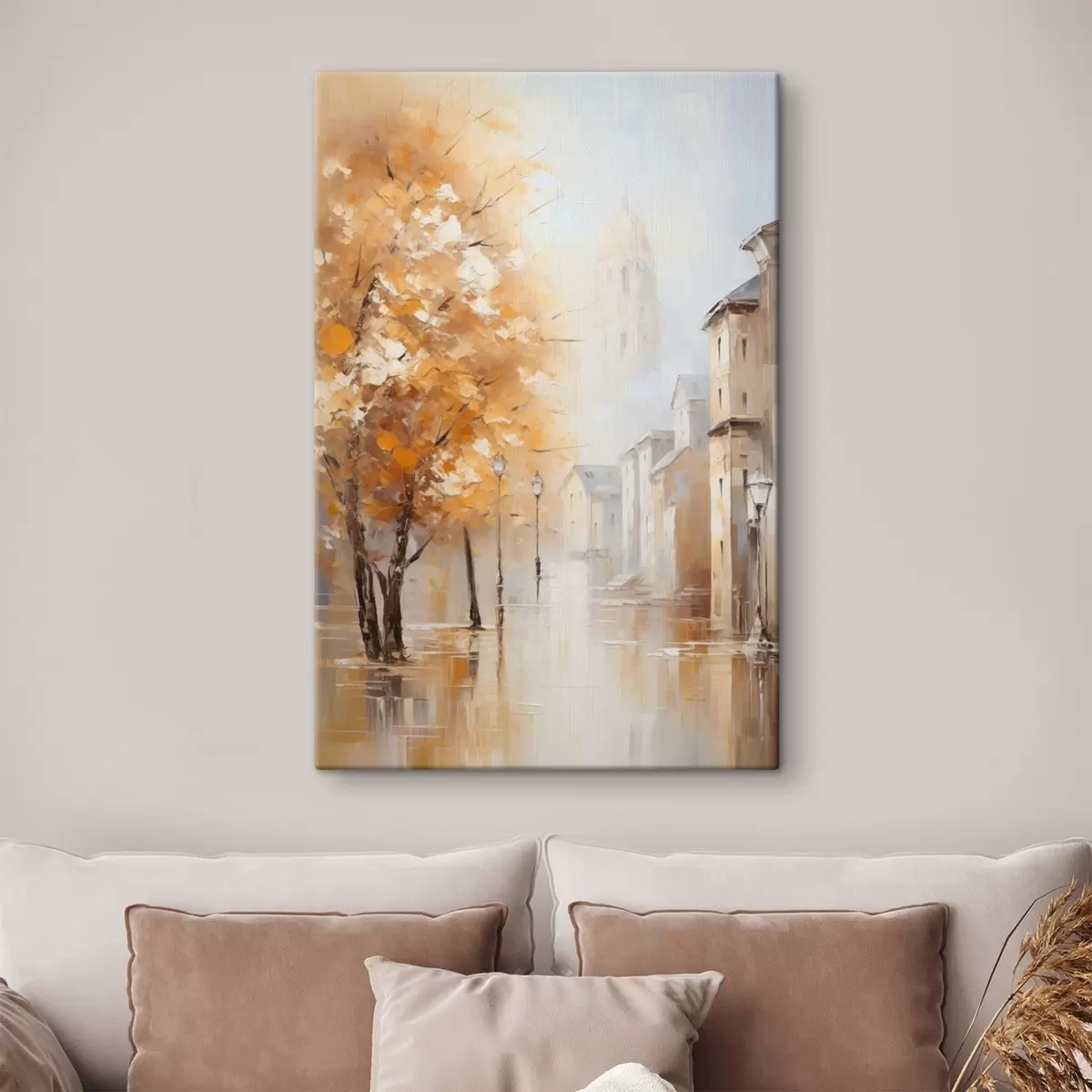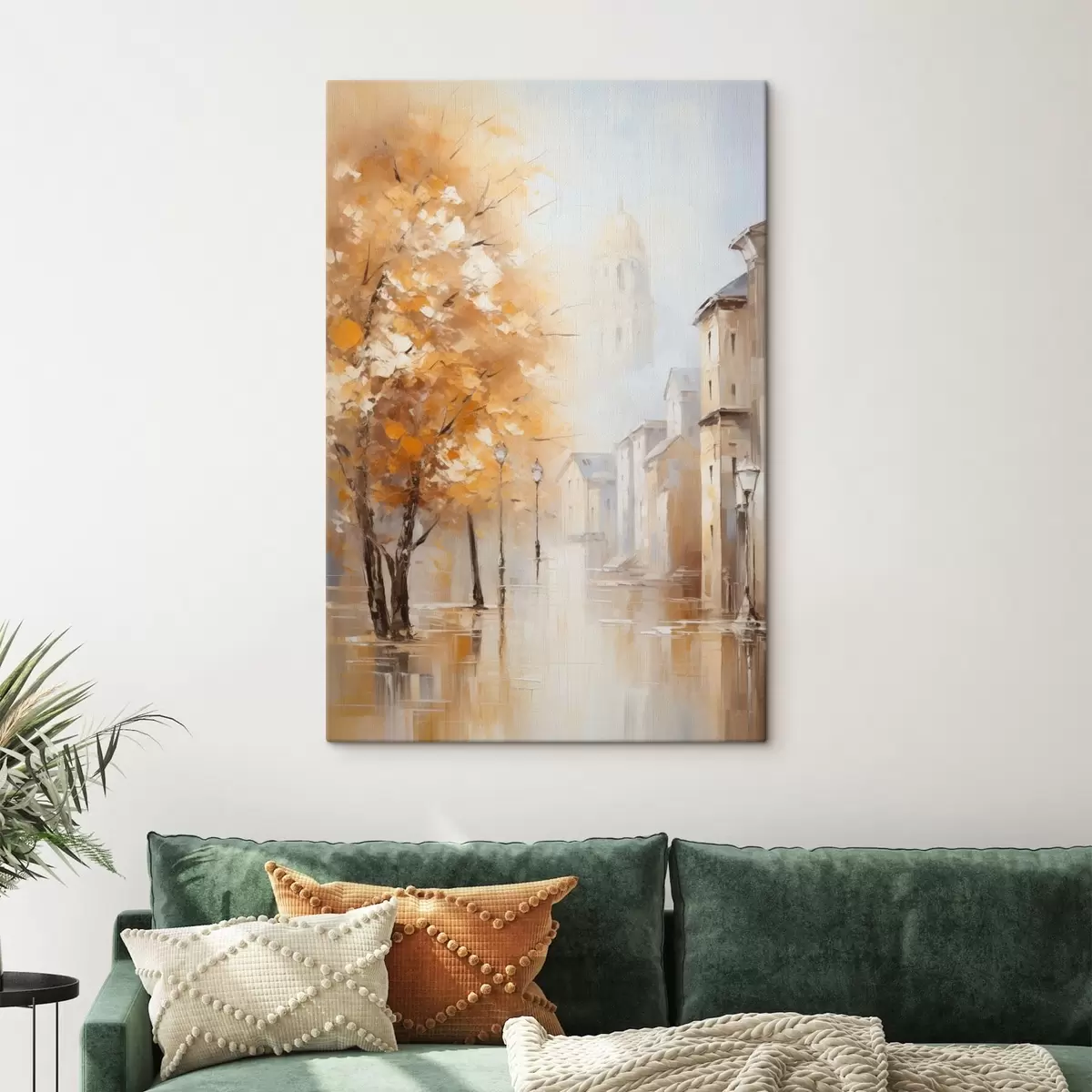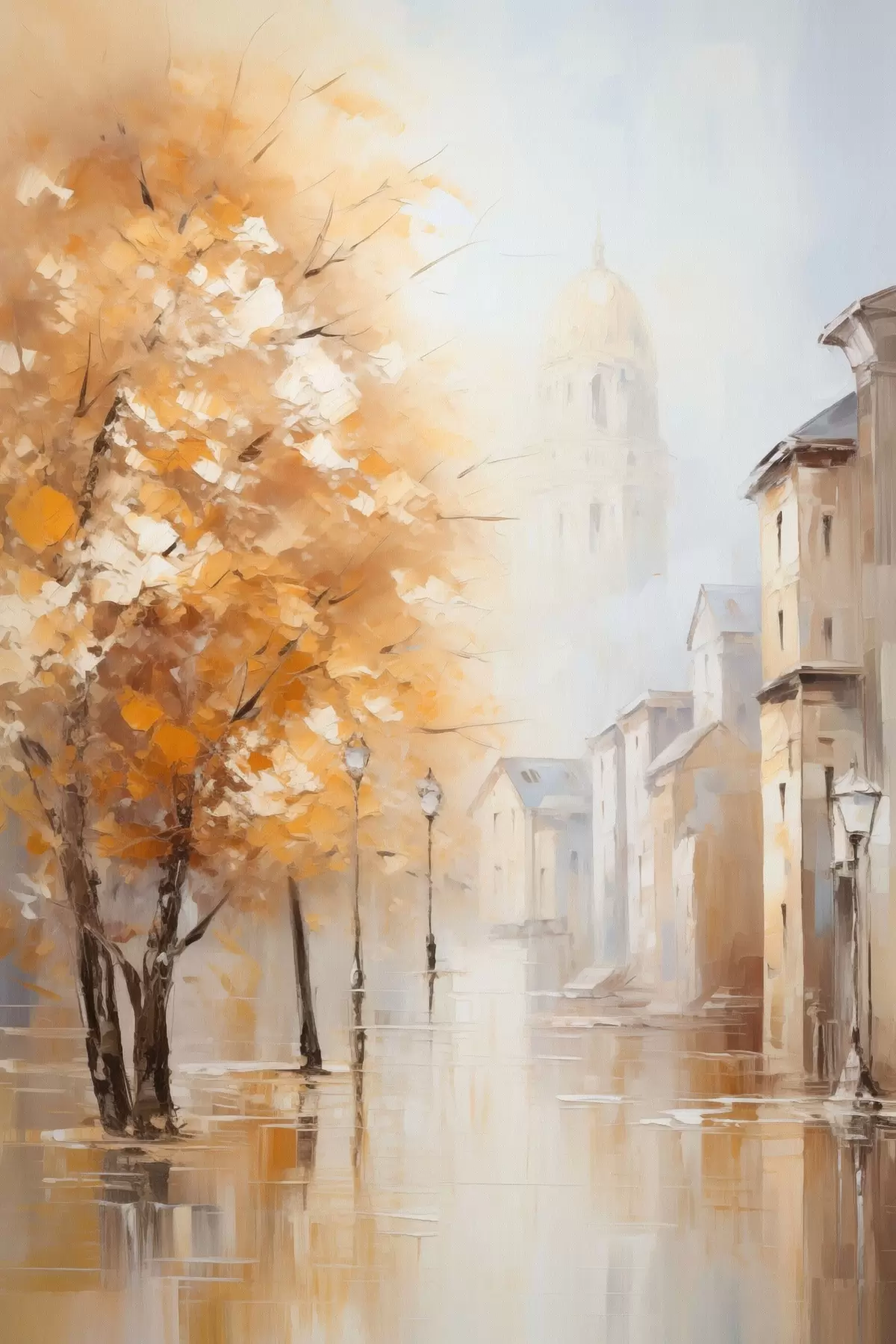 Peinture Rue bordée d'arbres et dôme dans la brume Art. s47304