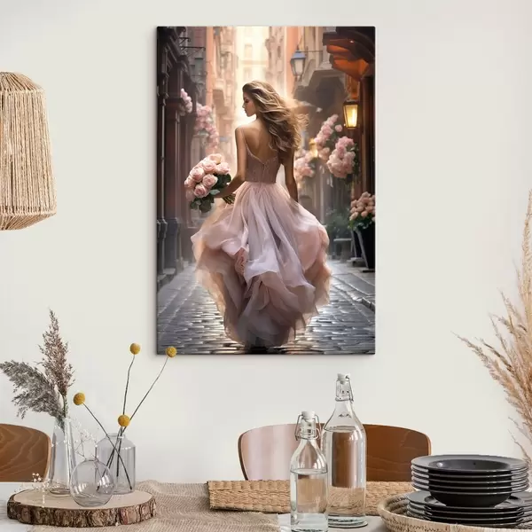 Peintures Femme en robe rose marchant dans une rue s47316