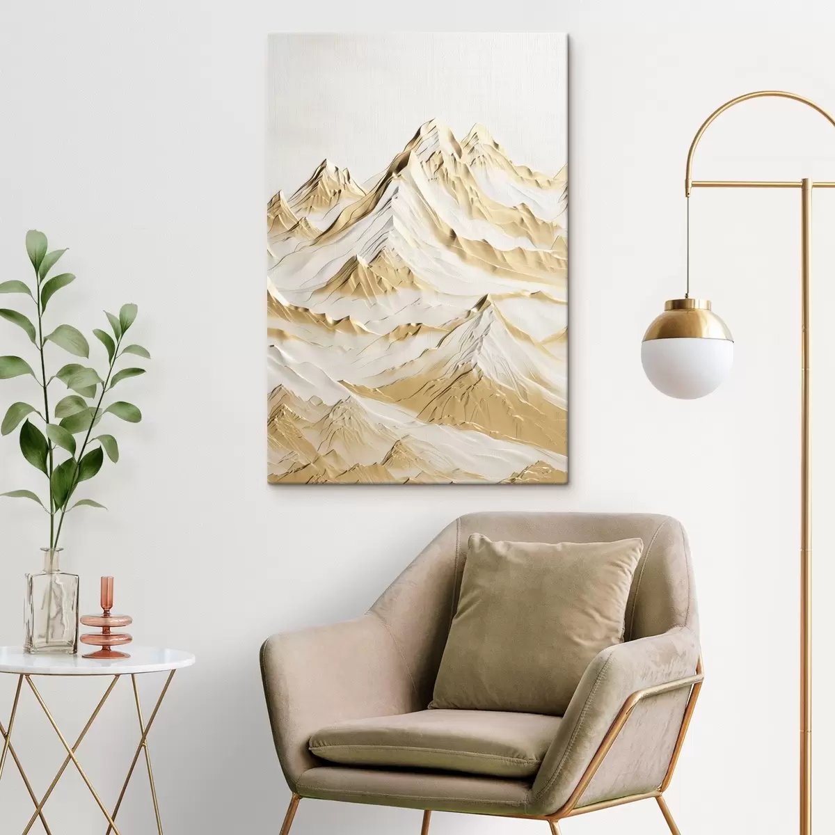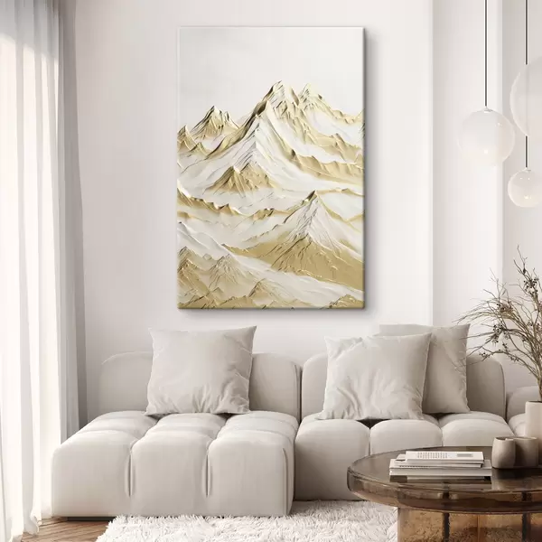 Peinture Un paysage de montagnes jaunes enneigées aux pics acérés et aux vallées profondes sous un ciel clair. Art. s47420
