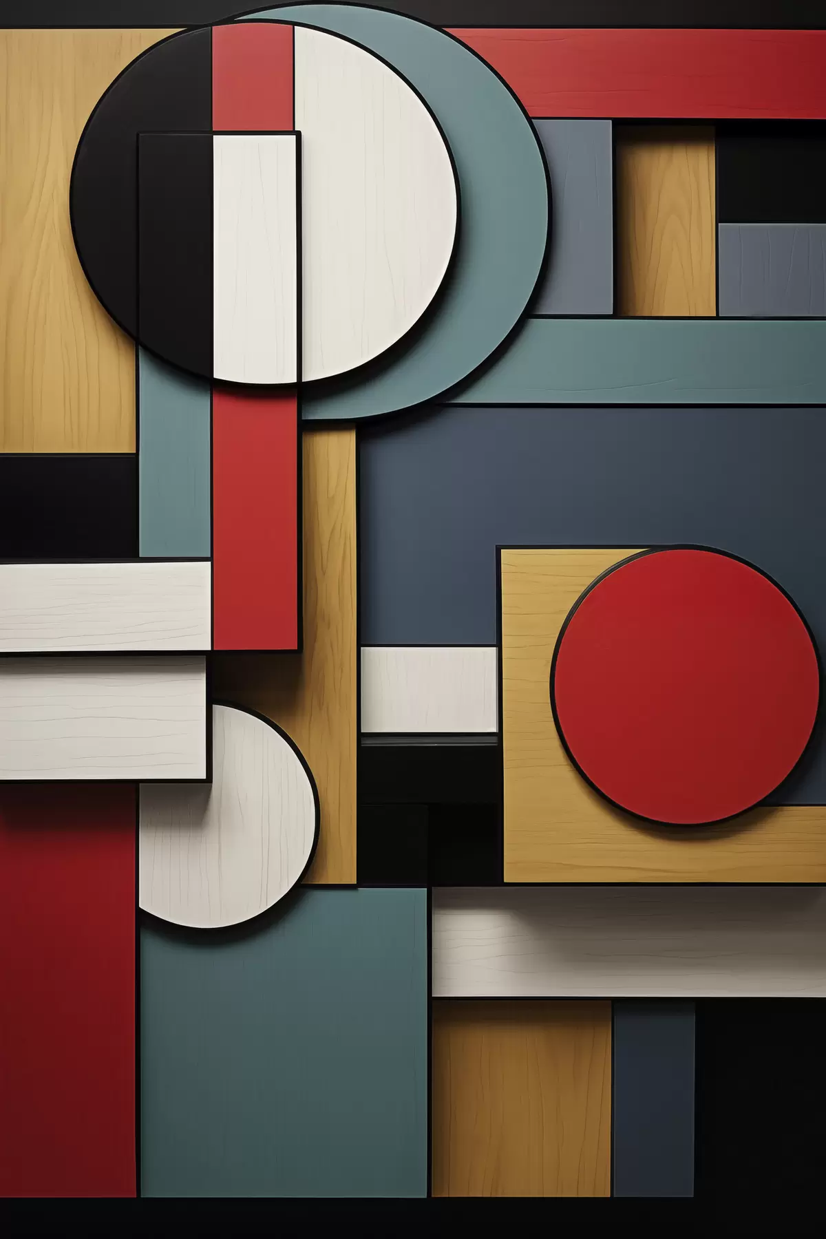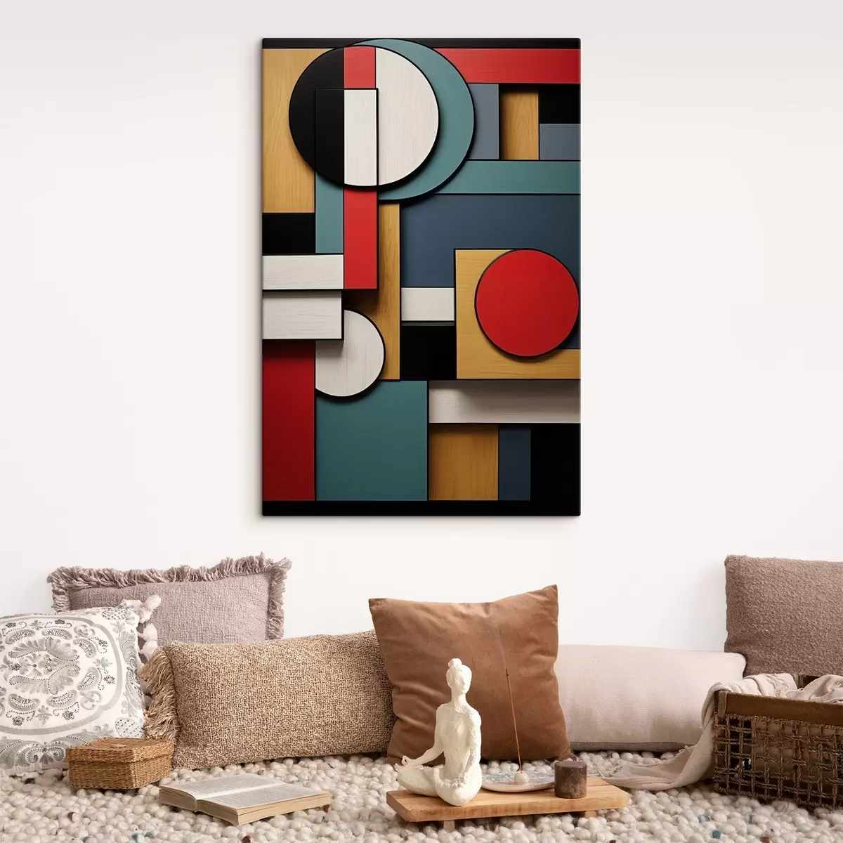Peintures Composition géométrique abstraite avec imitation de texture bois, rectangles et cercles rouges, noirs, blancs et bleu sarcelle s47875