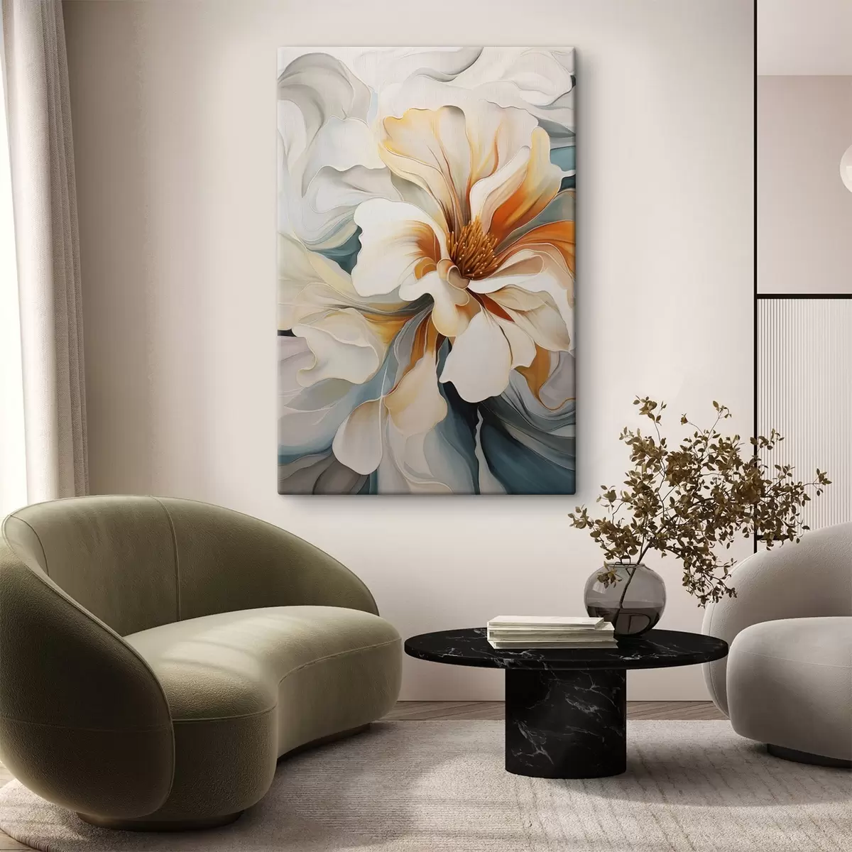 Peintures Fleur abstraite de grande taille avec des pétales blancs, orange et bleu sarcelle, fond texturé s47877