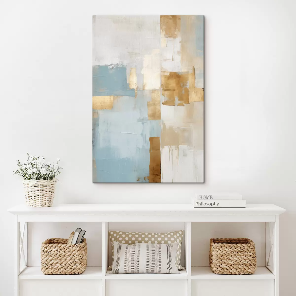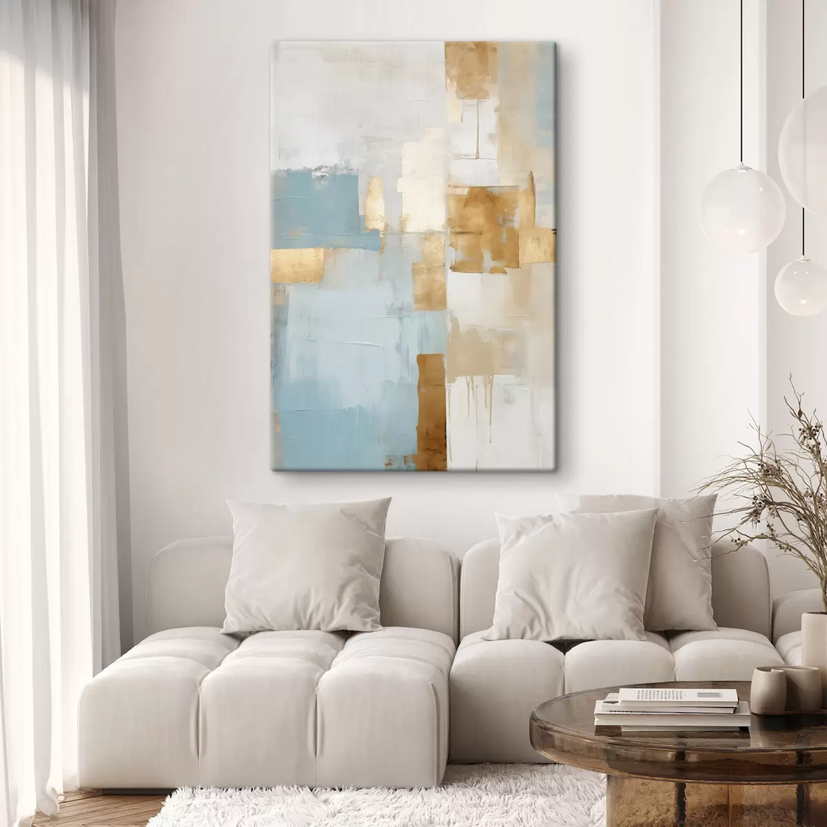 Peinture Formes géométriques abstraites aux couleurs jaune, bleu et blanc, composition texturée et minimaliste Art. s47882