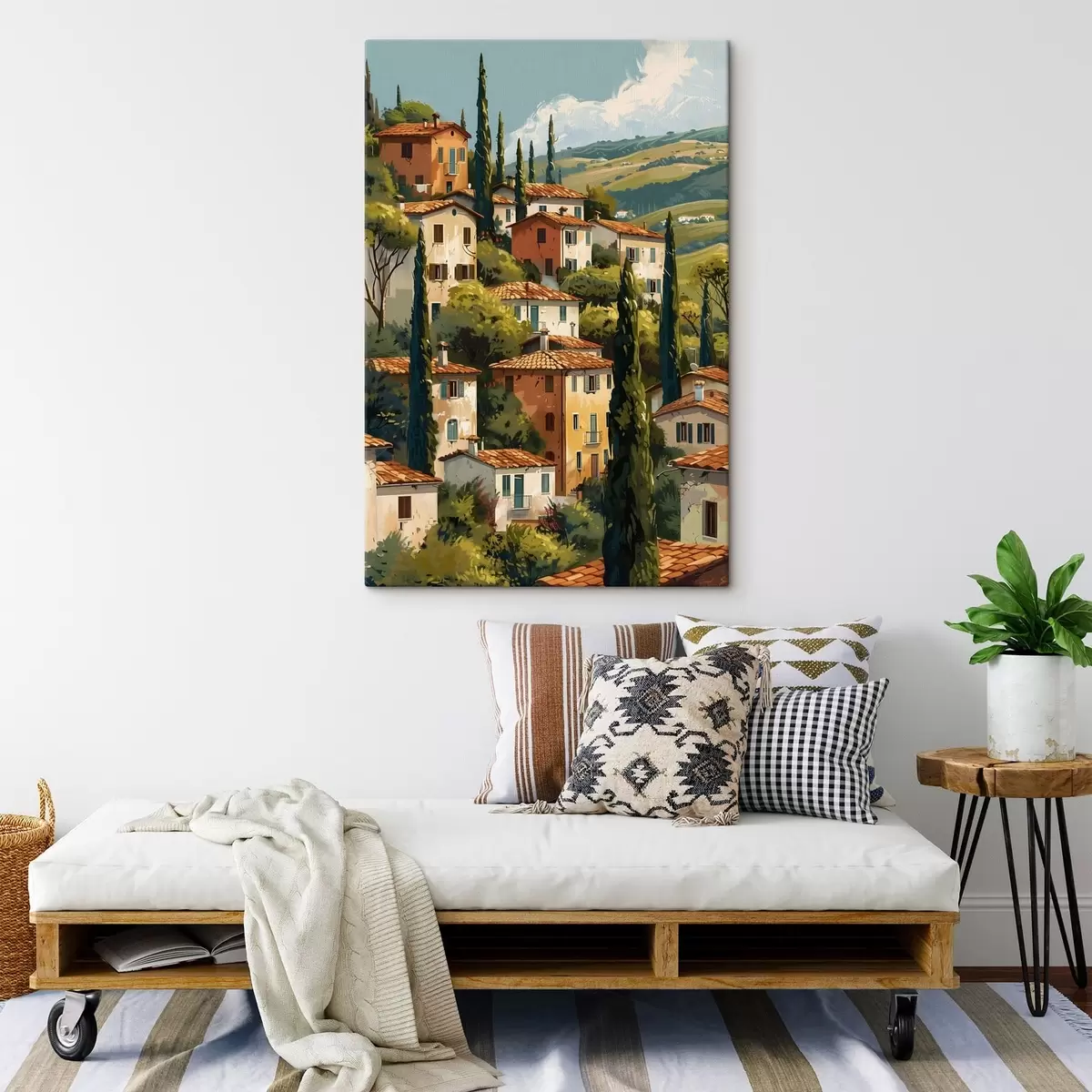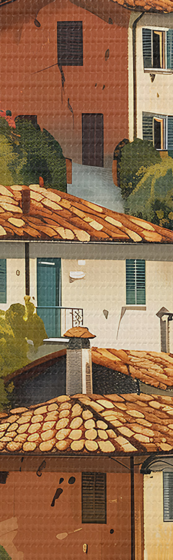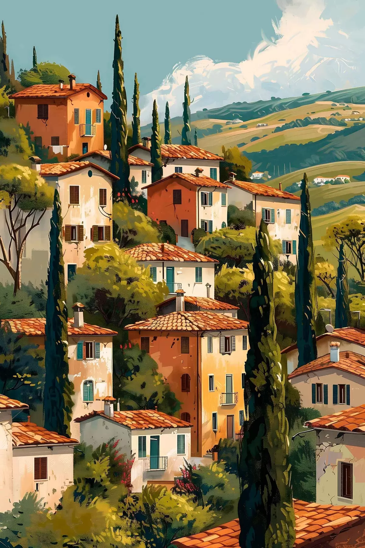 Peinture village méditerranéen à flanc de colline, maisons aux tons chauds empilées les unes sur les autres avec des toits en terre cuite Art. s47950