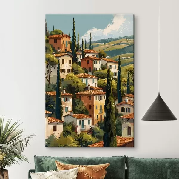 Peintures village méditerranéen à flanc de colline, maisons aux tons chauds empilées les unes sur les autres avec des toits en terre cuite s47950