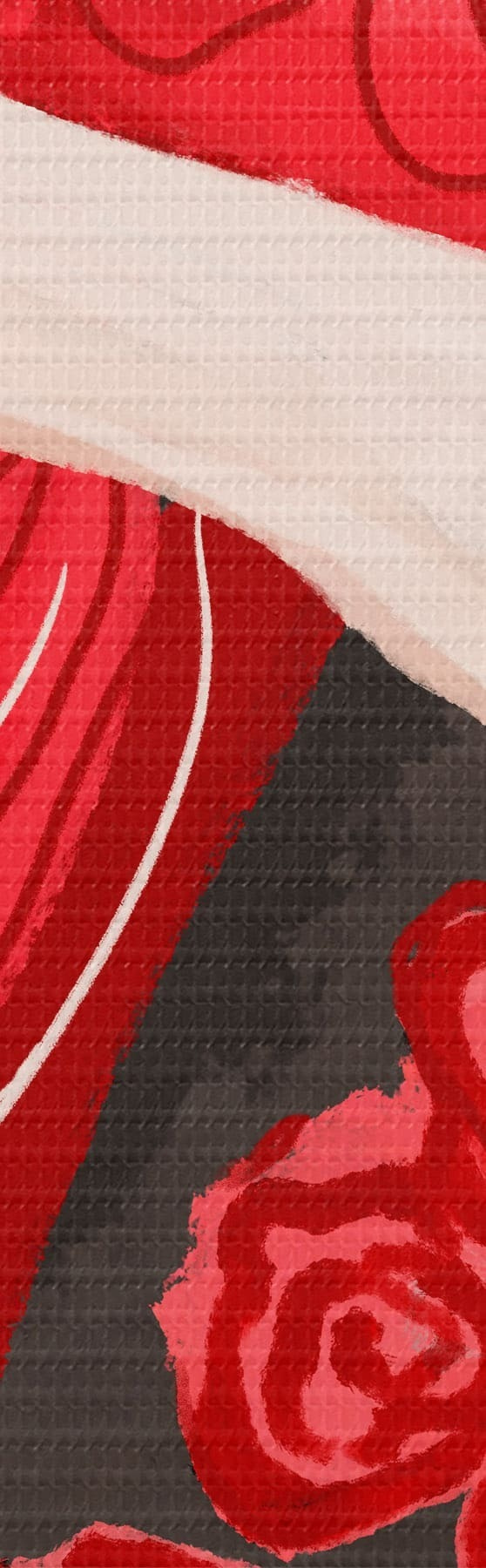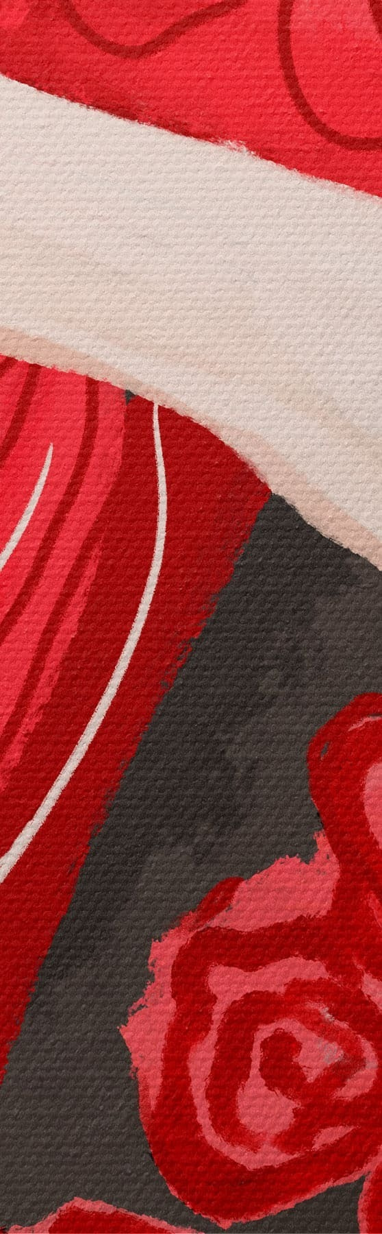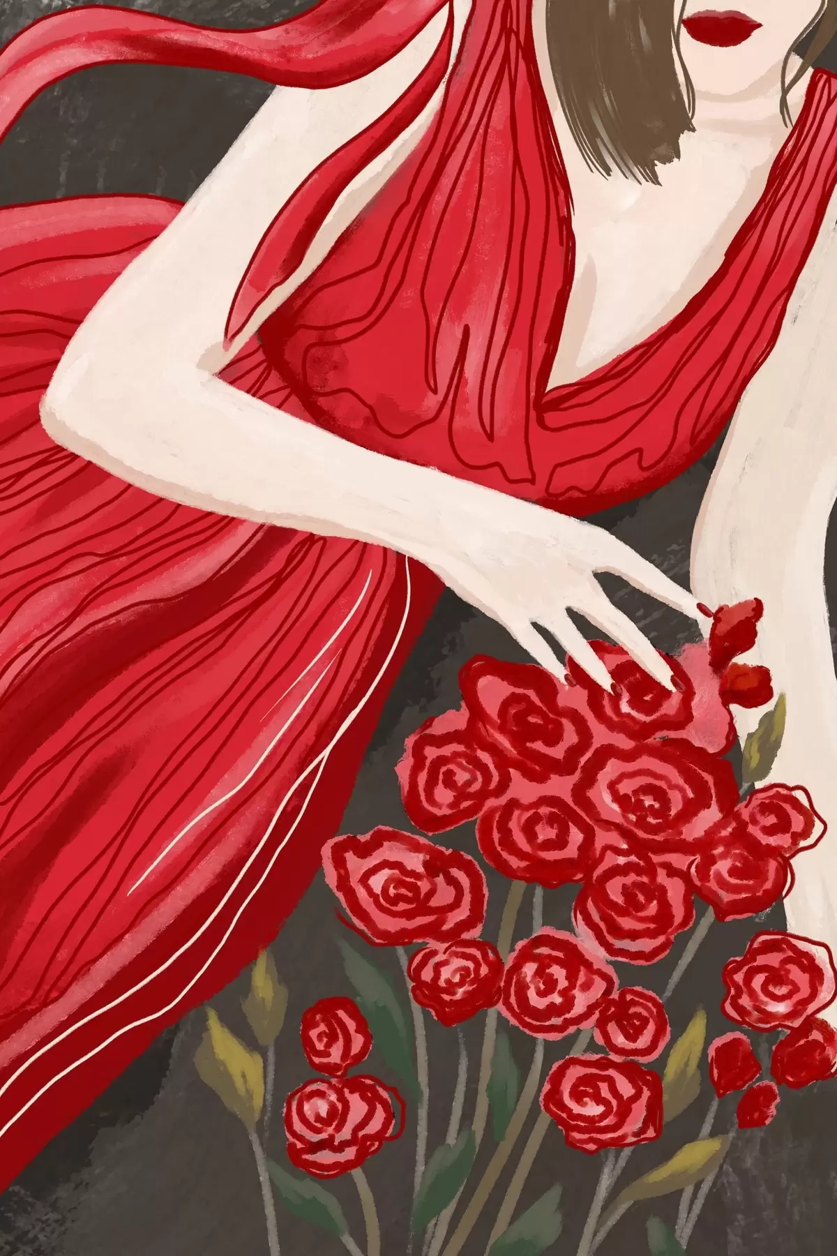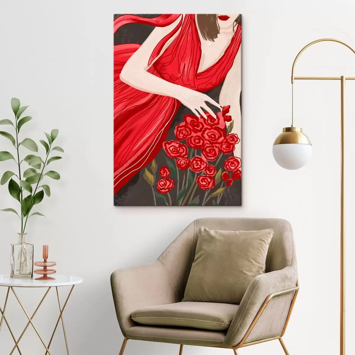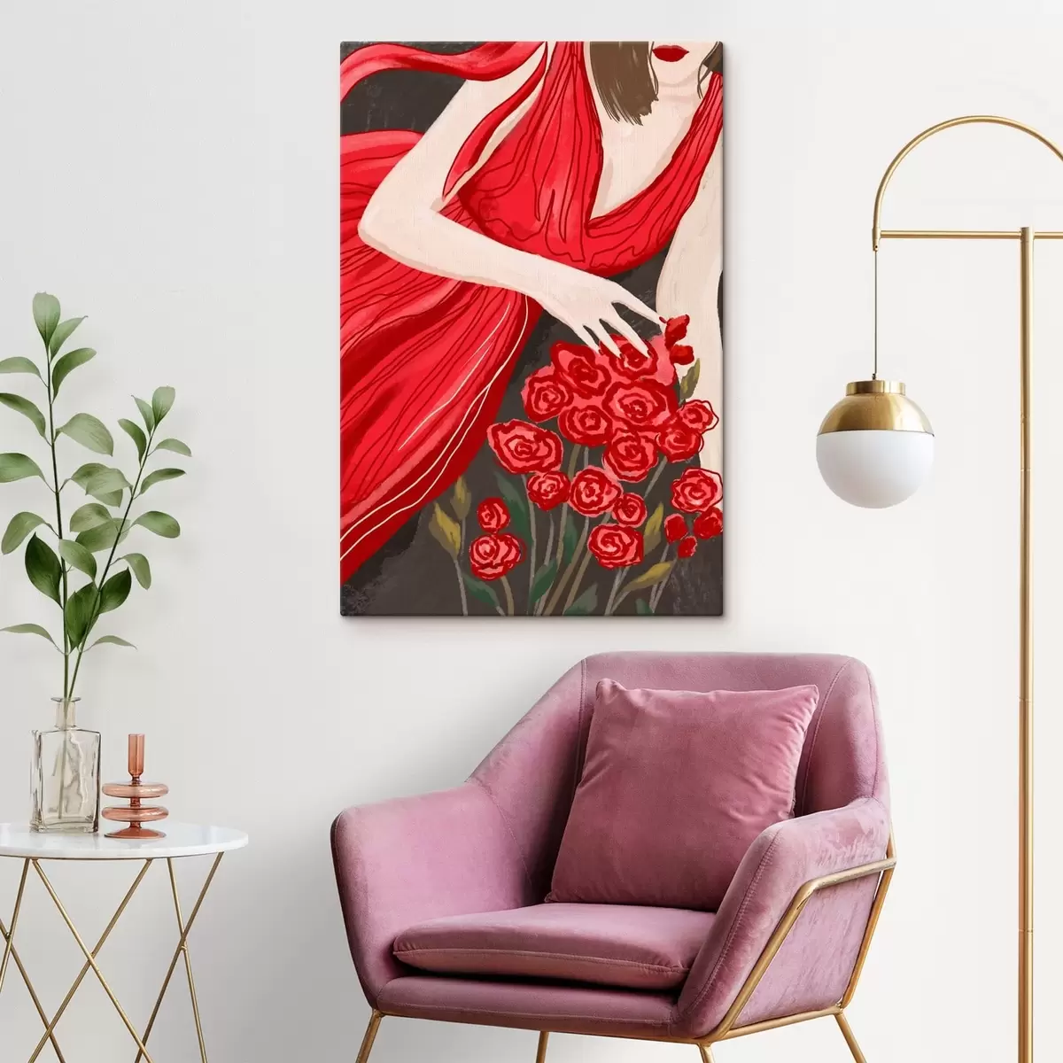 Peinture Femme en robe rouge avec un bouquet de roses Art. s48026