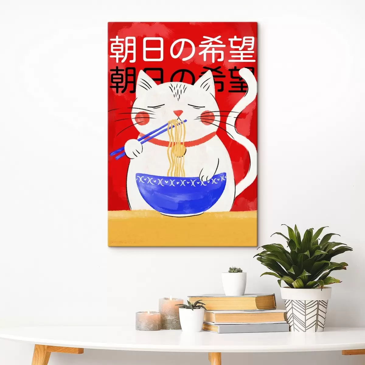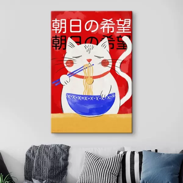 Peintures Illustration représentant un chat en train de manger des nouilles sur fond rouge s48031