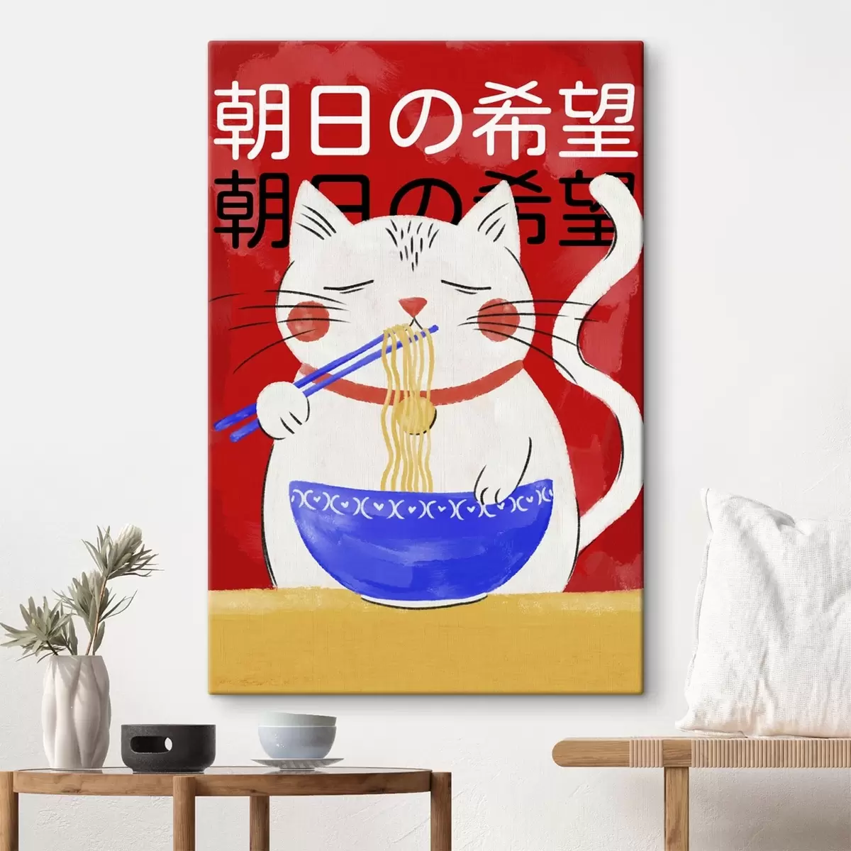 Peinture Illustration représentant un chat en train de manger des nouilles sur fond rouge Art. s48031