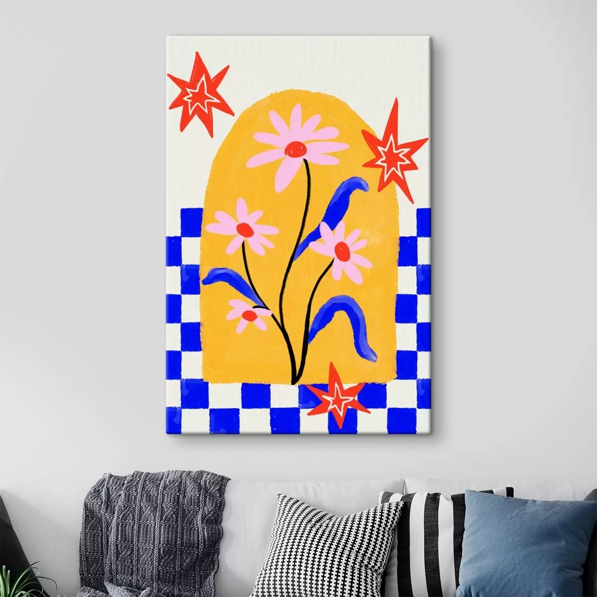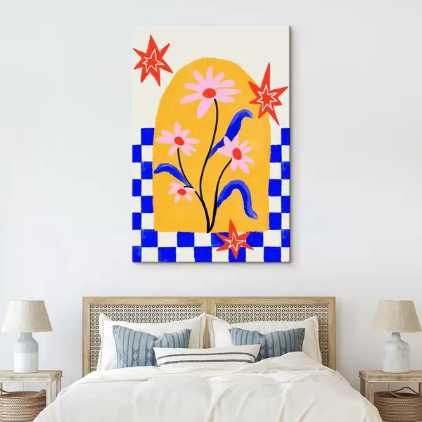 Peintures Fleurs aux couleurs vives sur fond jaune avec des motifs bleus s48034