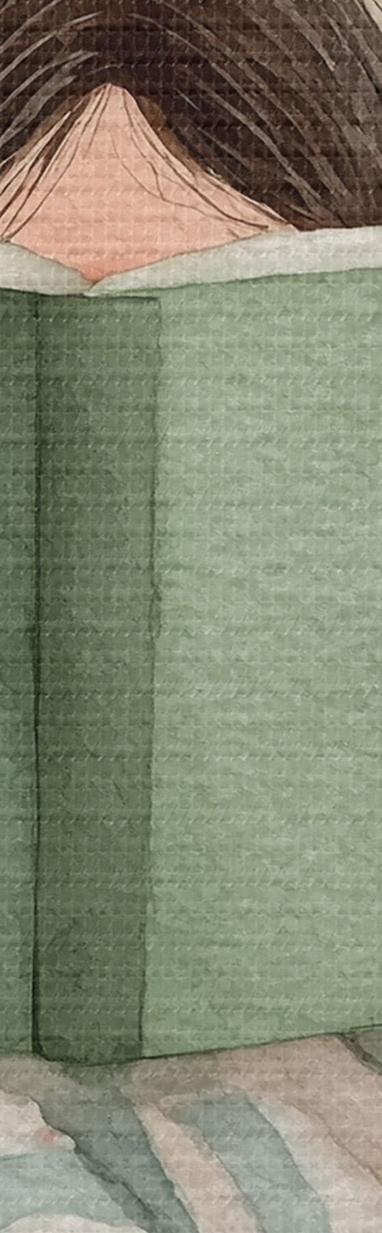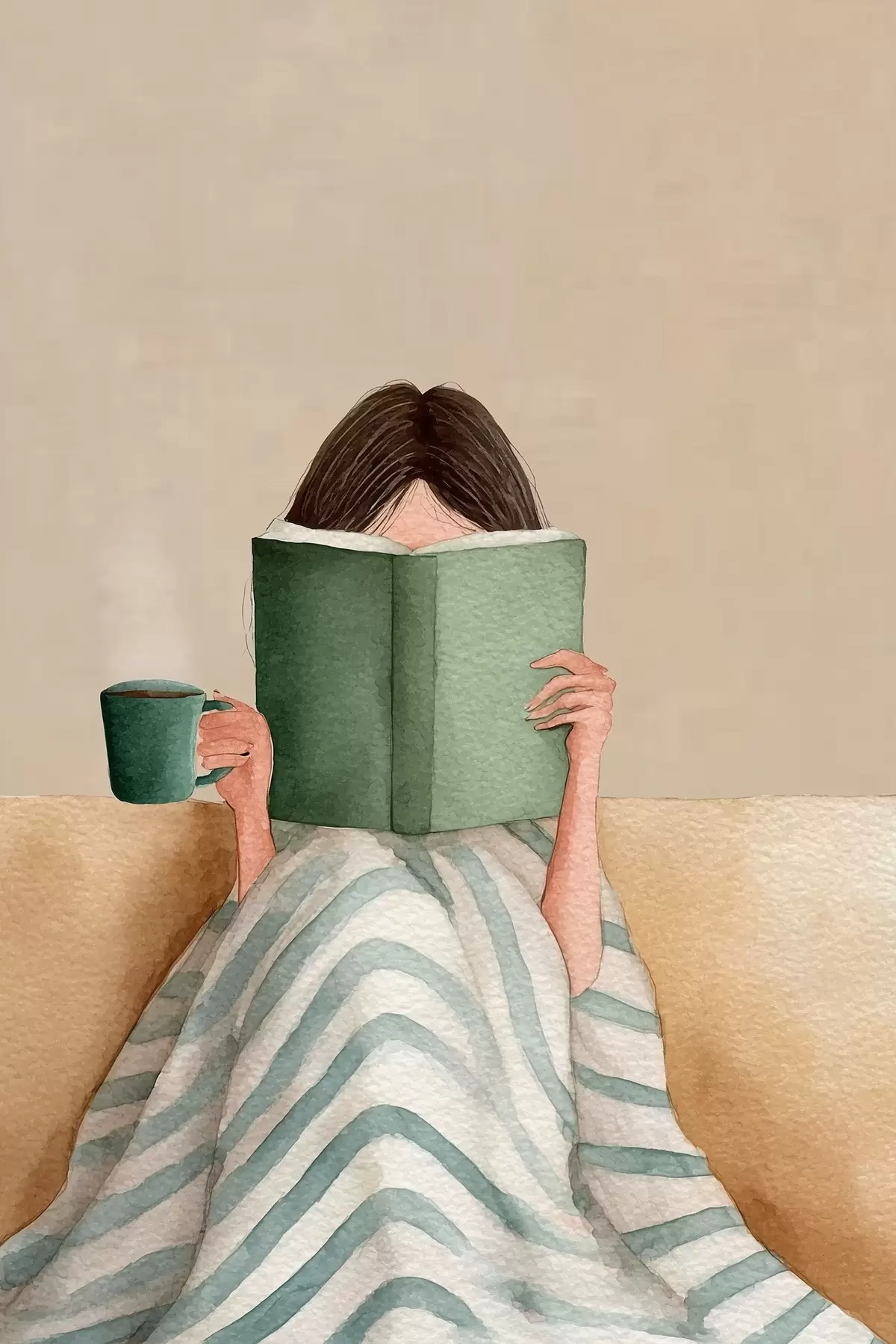 Peinture Illustration à l'aquarelle représentant une femme assise sur un canapé en train de lire un livre. Art. s48114