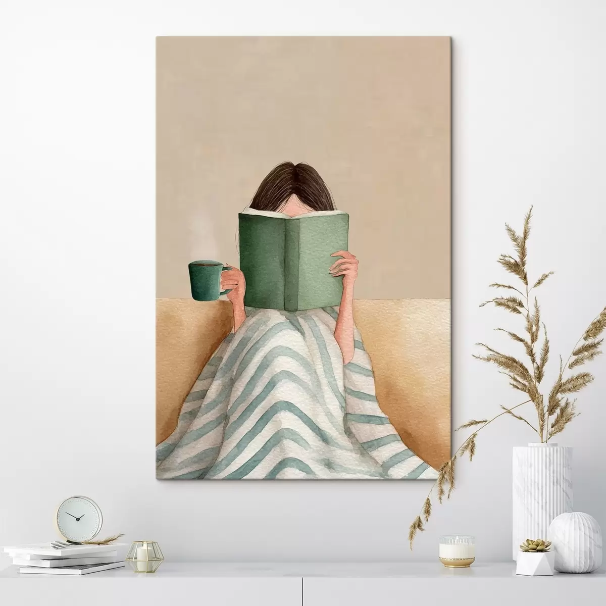 Peintures Illustration à l'aquarelle représentant une femme assise sur un canapé en train de lire un livre. s48114