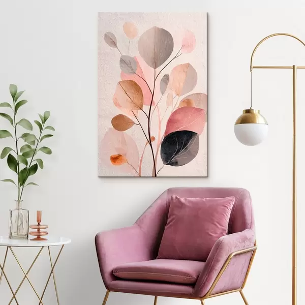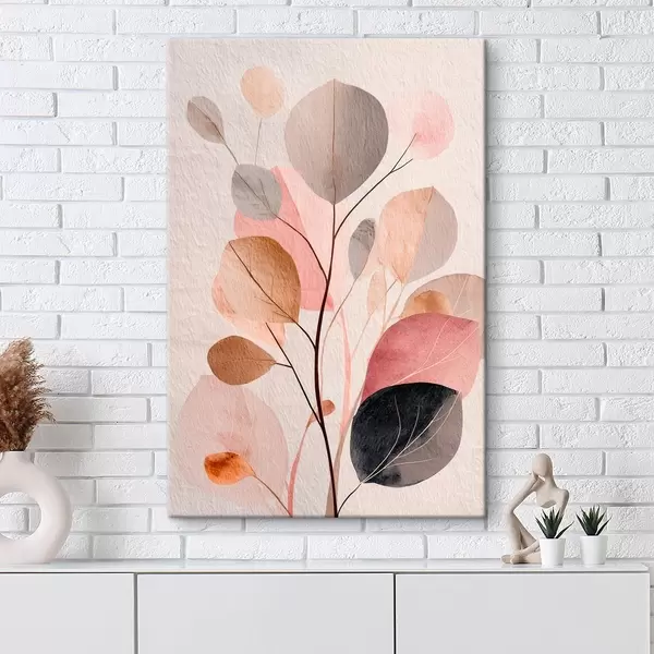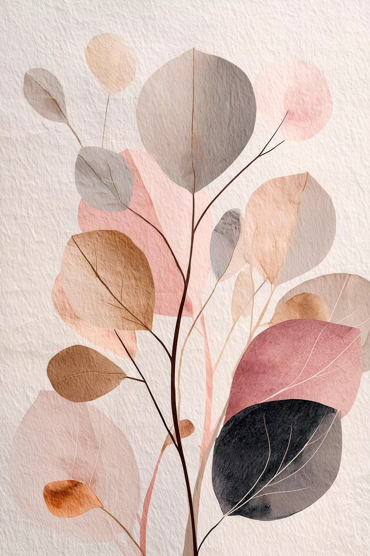 Peintures Branche abstraite aux feuilles arrondies, dans des tons chauds de beige et de corail s48187