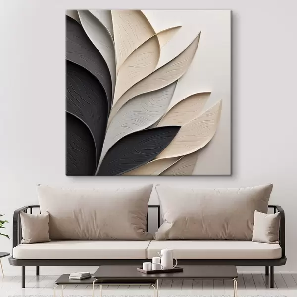 Peintures Composition abstraite de feuilles superposées, de formes courbes en noir, blanc et beige, œuvre d'art texturée s48382