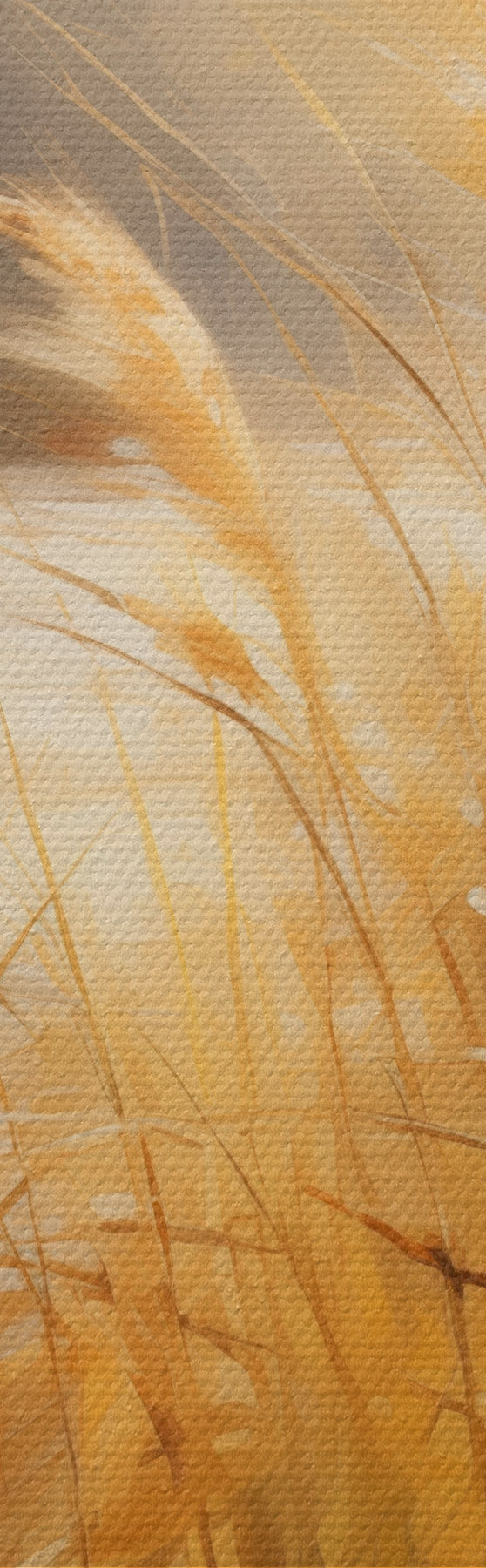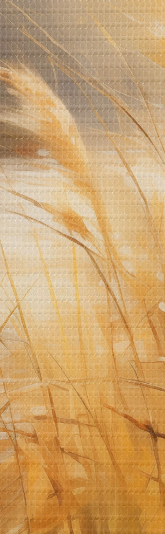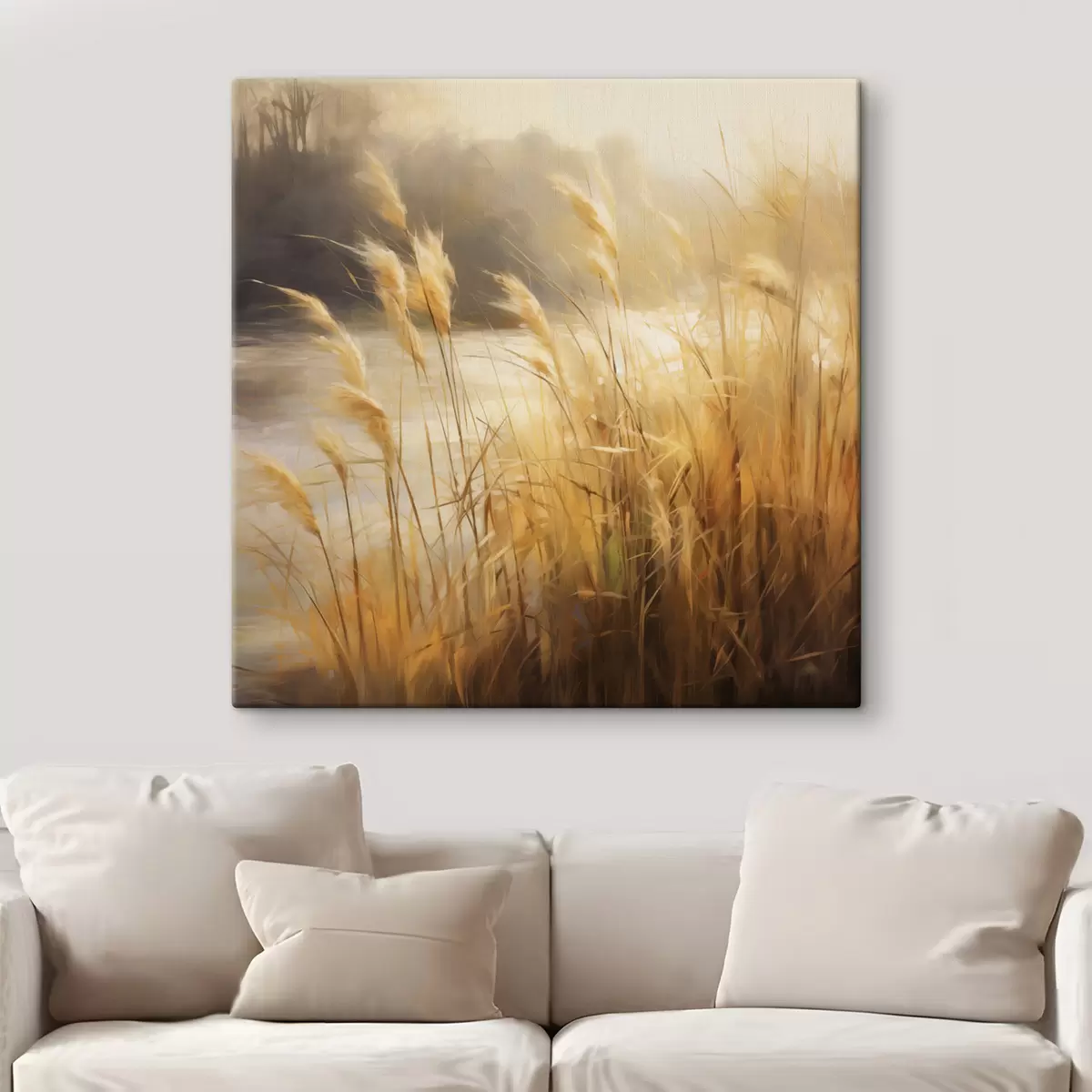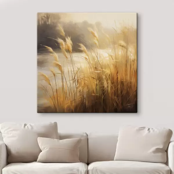 Peinture Au premier plan, de hautes herbes aux épillets secs ; à l'arrière-plan, un lac et des arbres Art. s48394