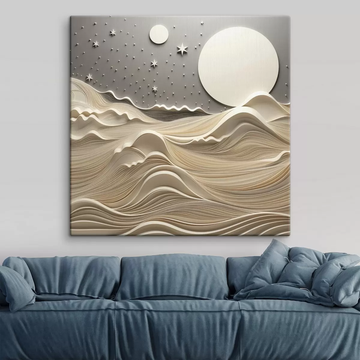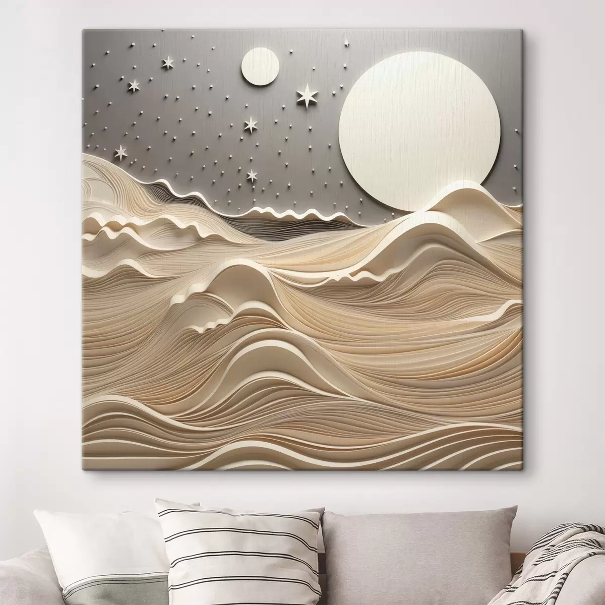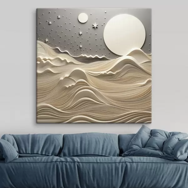 Peintures Un paysage minimaliste et stylisé, avec des collines ondulantes et une grande lune dans un ciel étoilé, œuvre d'art abstrait s48401