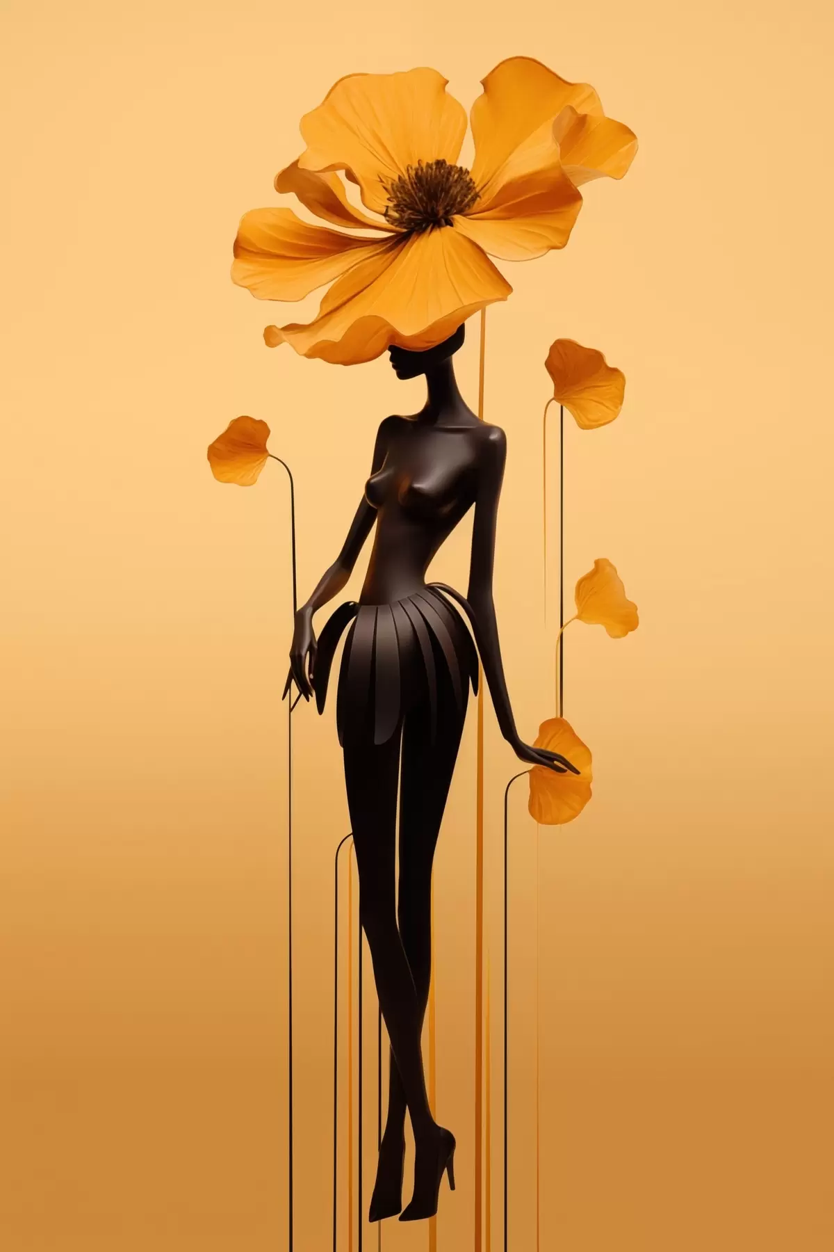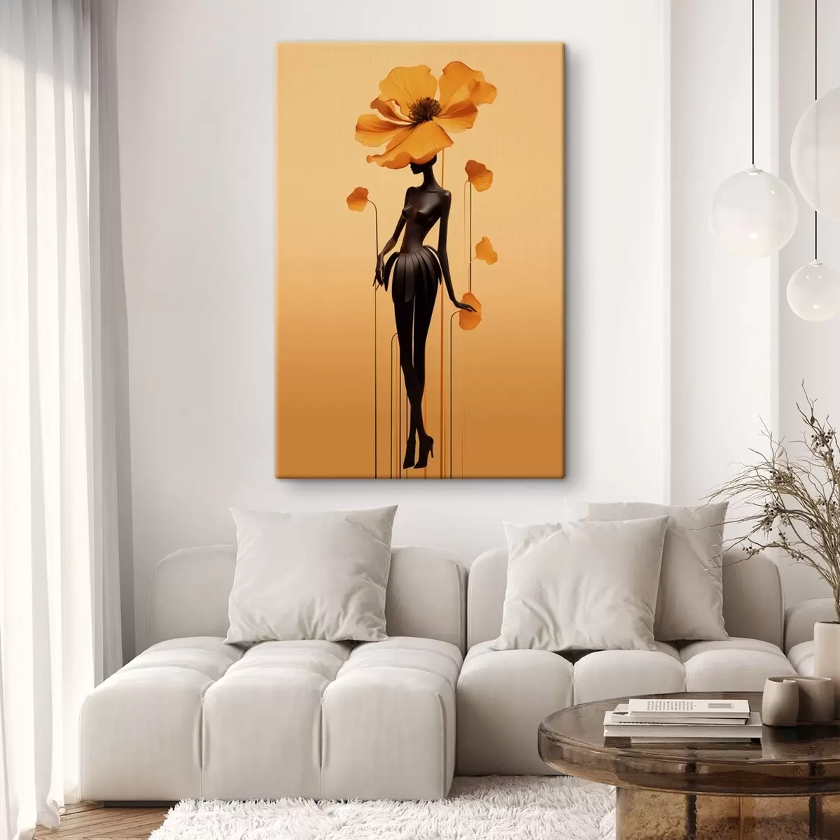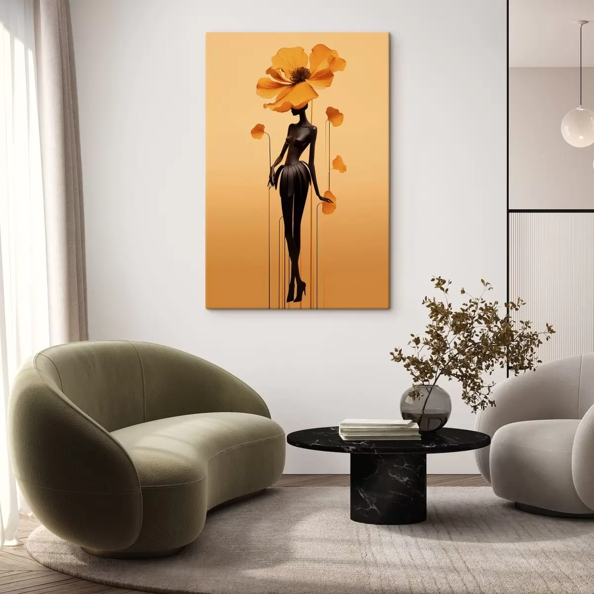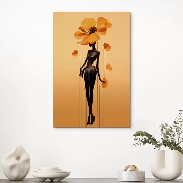 Peinture Une silhouette élégante ornée de fleurs sur un fond aux tons dégradés chauds Art. s48619