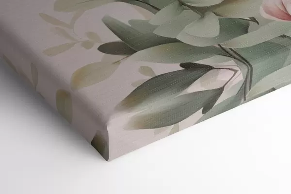 Peinture Un bouquet de fleurs aux couleurs pastel avec des feuilles d'eucalyptus, sur fond rose pâle Art. s48727