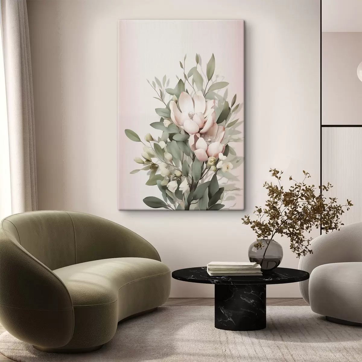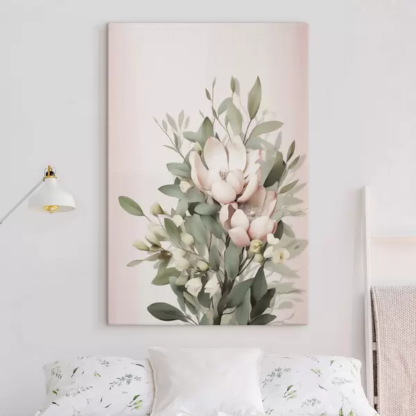 Peinture Un bouquet de fleurs aux couleurs pastel avec des feuilles d'eucalyptus, sur fond rose pâle Art. s48728