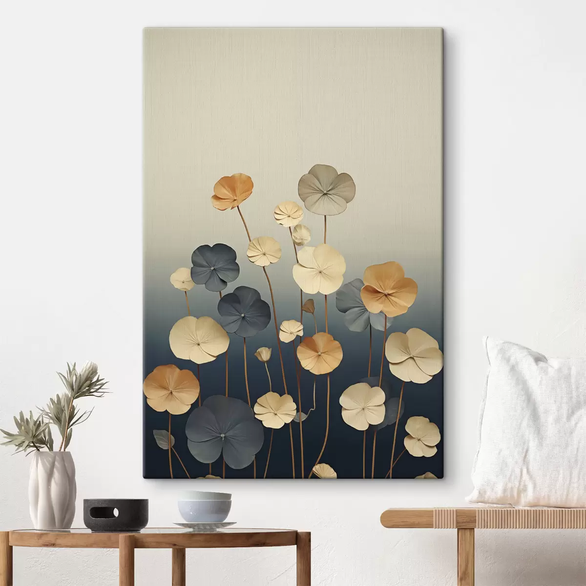 Peintures Des feuilles de nénuphar sur un fond sobre de beige et de bleu foncé s48733