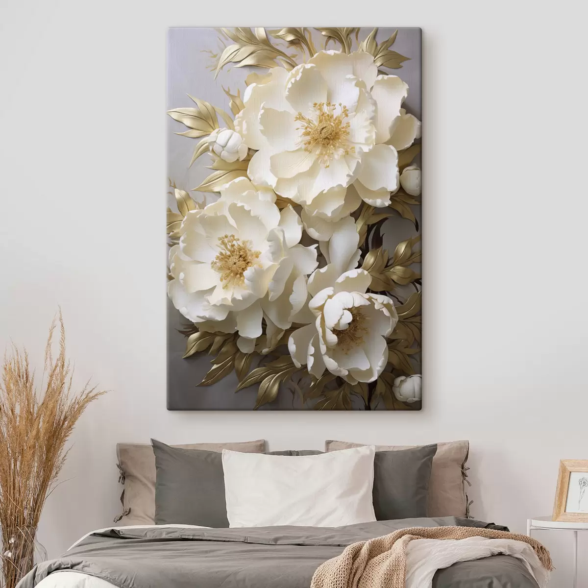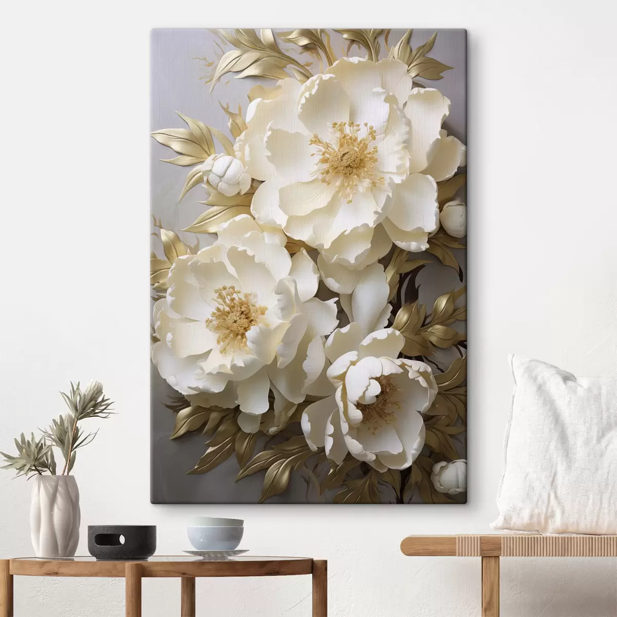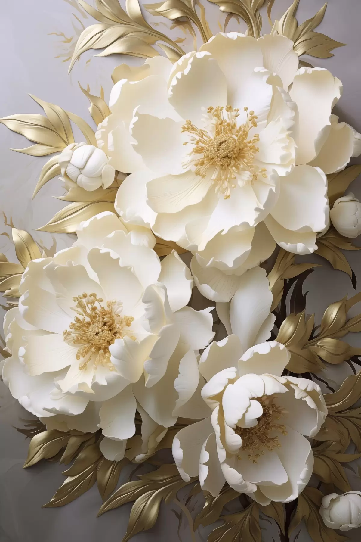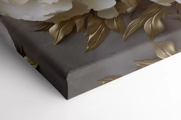 Peinture De grandes pivoines blanches aux feuilles jaunes sur fond gris Art. s48754