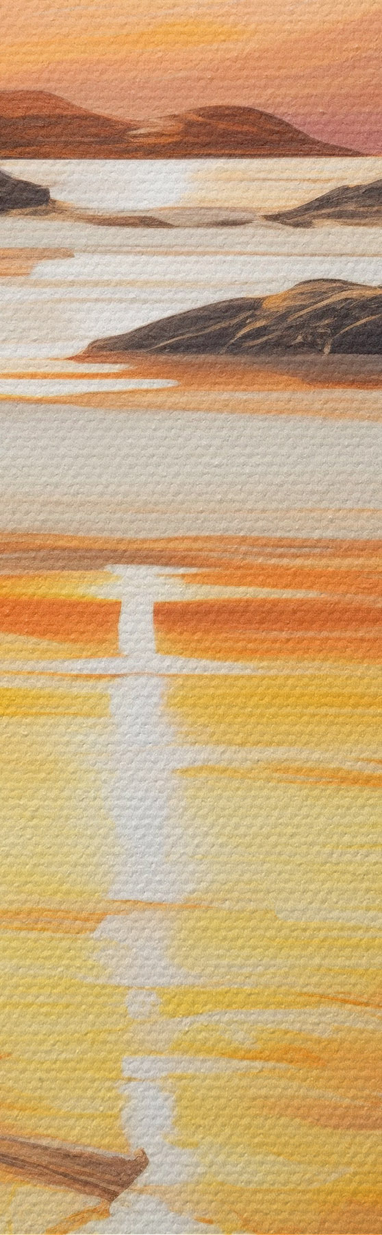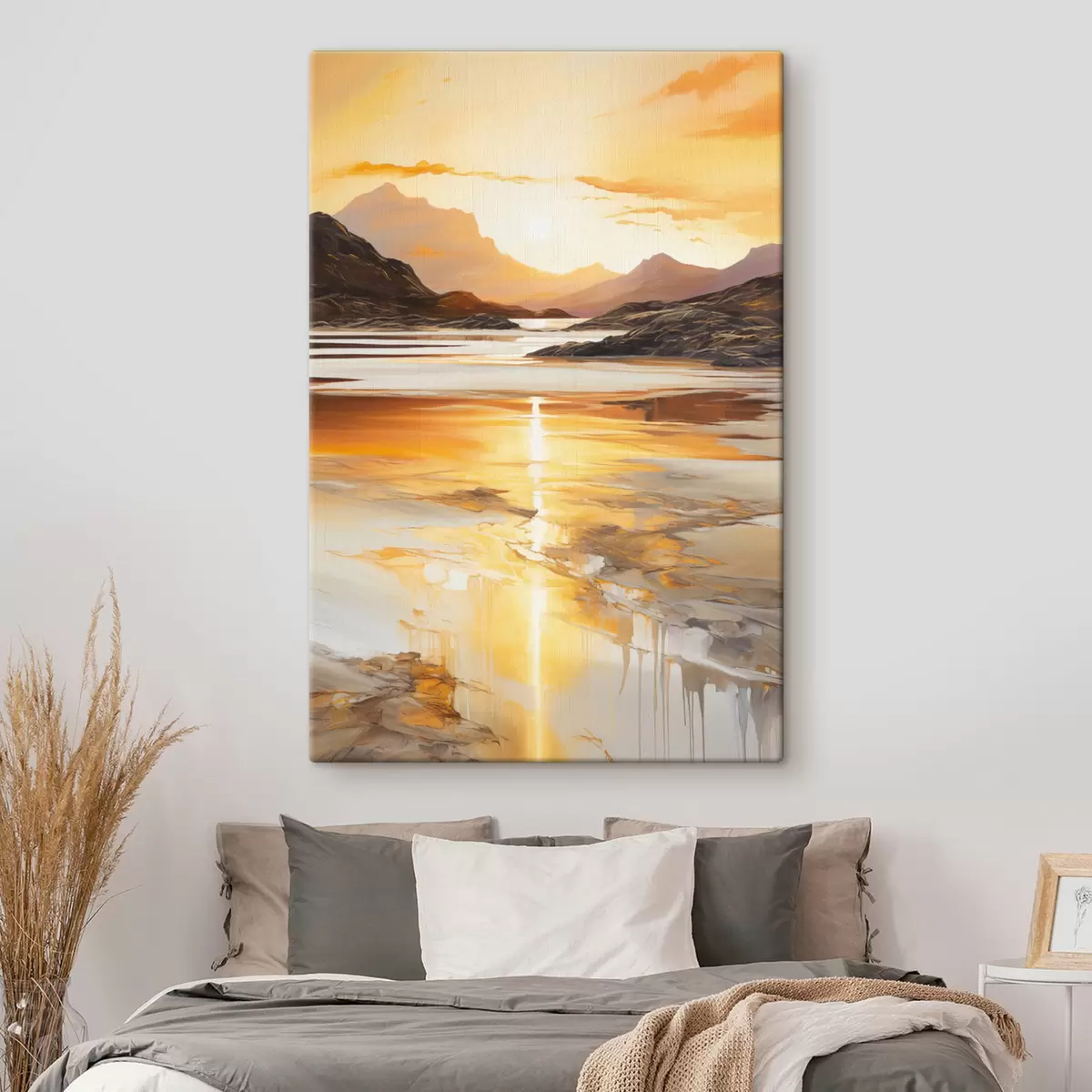 Peinture Un paysage avec une rivière et des montagnes sous un ciel orange aux teintes chaudes, au coucher du soleil Art. s48755