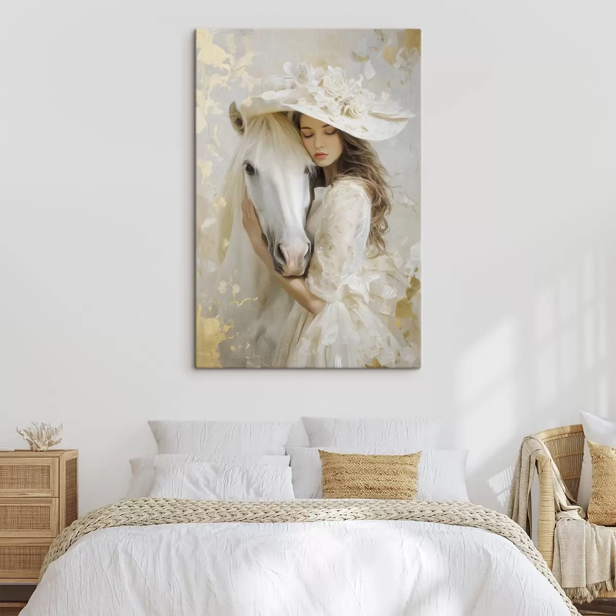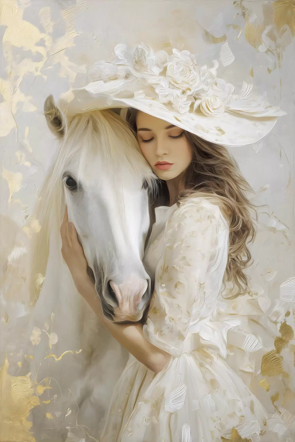 Peinture une jeune fille avec un cheval blanc, peinte dans un style à l'huile Art. s48790