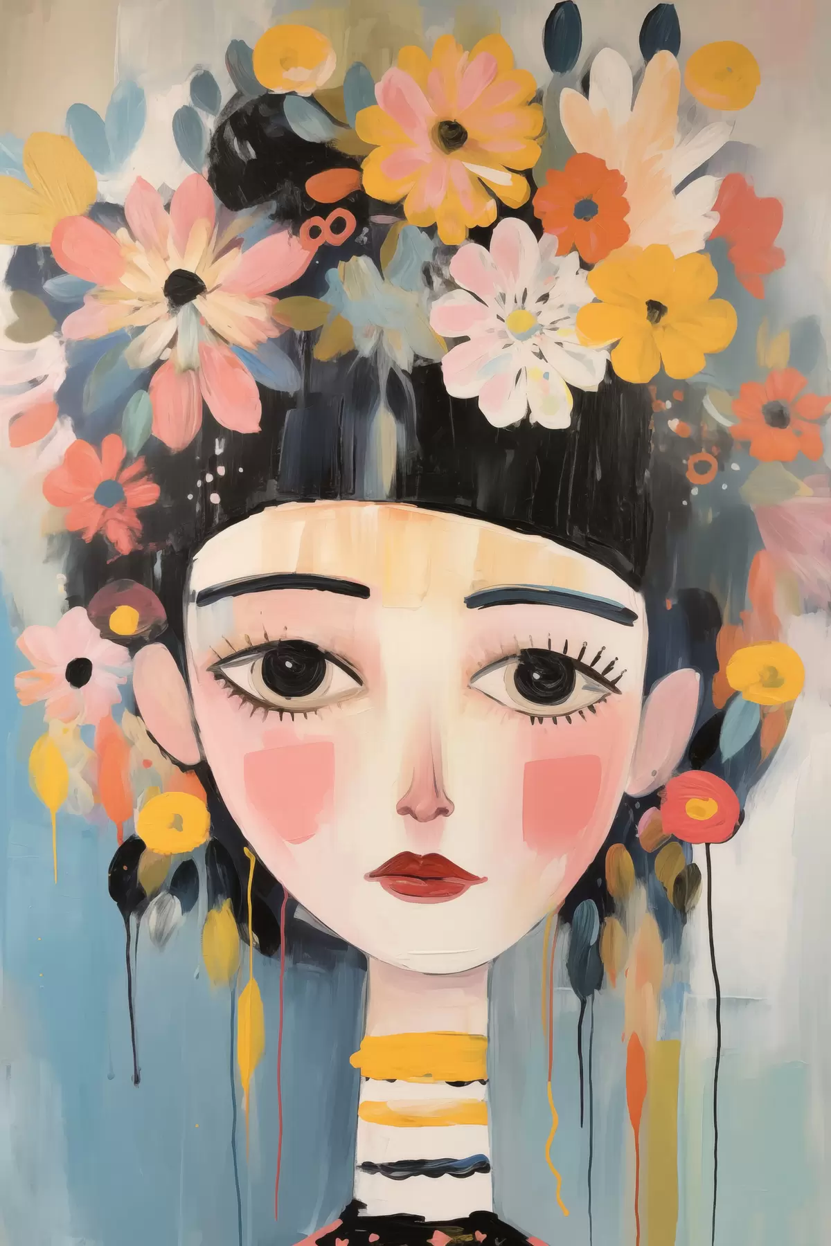 Peinture Portrait d'une femme avec des fleurs dans les cheveux, style abstrait Art. s48935