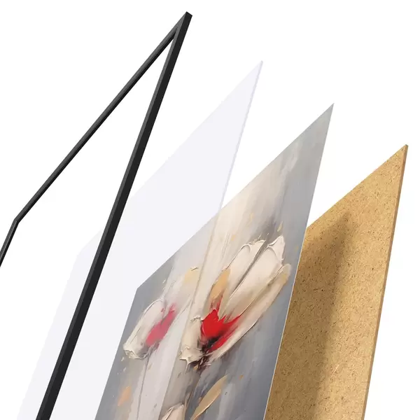 Le poster se compose d'un cadre, d'un plexiglas, d'une image imprimée et d'un support en aggloméré. Le poster peut être immédiatement accroché au mur grâce aux fixations au dos.