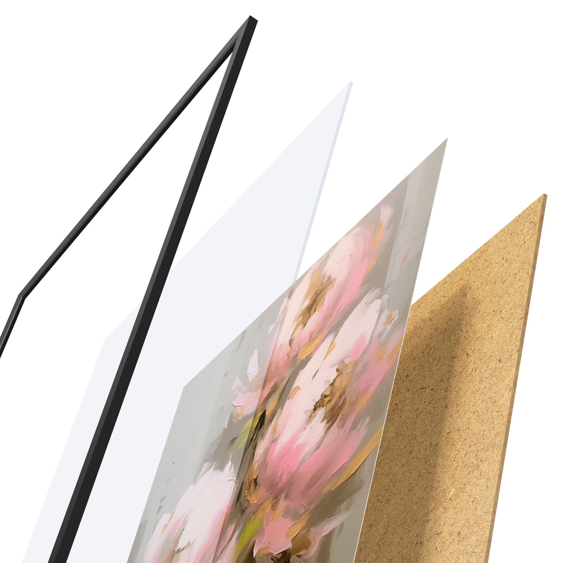 Le poster se compose d'un cadre, d'un plexiglas, d'une image imprimée et d'un support en aggloméré. Le poster peut être immédiatement accroché au mur grâce aux fixations au dos.