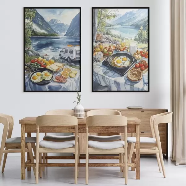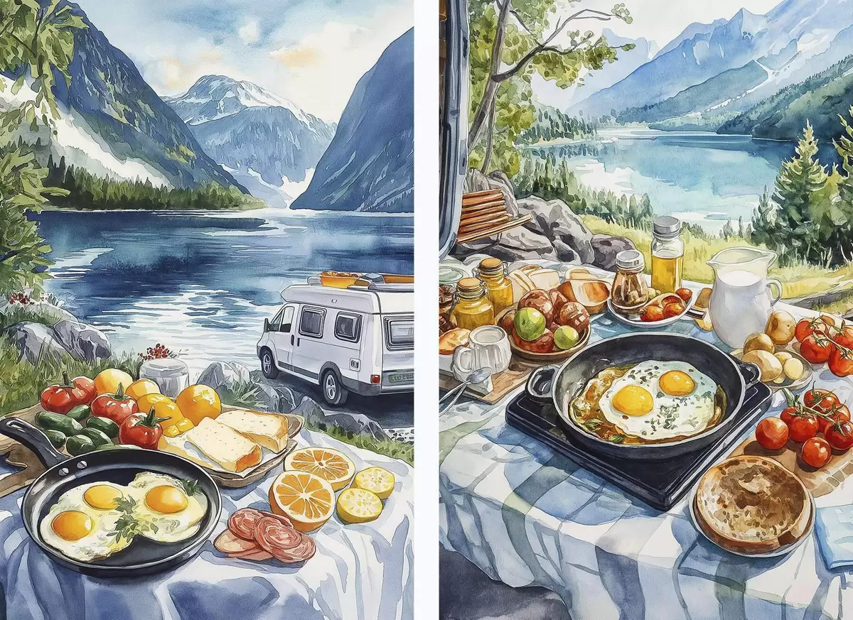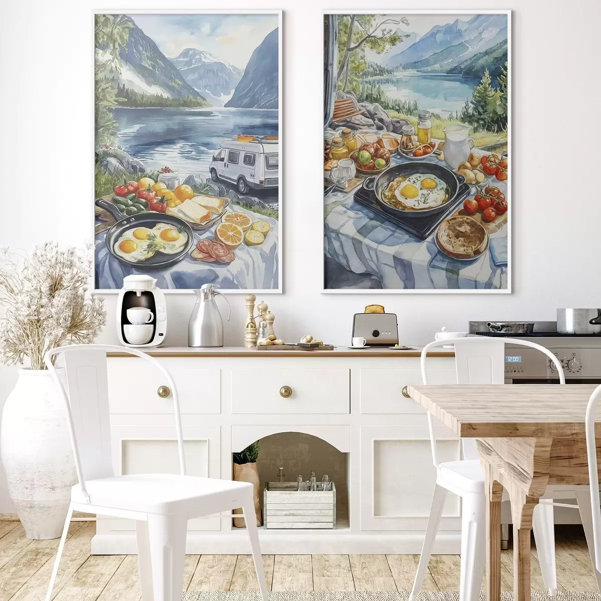 Affiche Petit déjeuner dans la nature, voyage, vie en plein air, style aquarelle, Norvège d00404