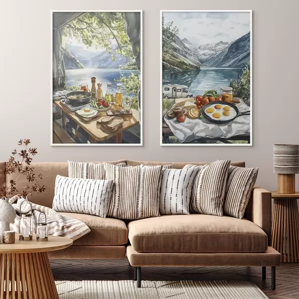 Affiche Camping, petit déjeuner esthétique près du lac, style aquarelle d00405