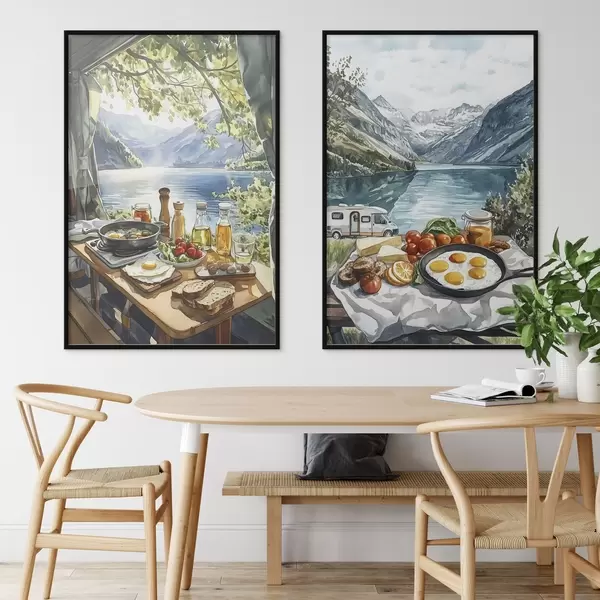 Affiche Camping, petit déjeuner esthétique près du lac, style aquarelle Non d00405