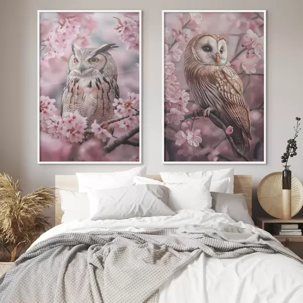 Affiche Hiboux sur le cerisier, fleurs roses, réalisme, nature Non d00411