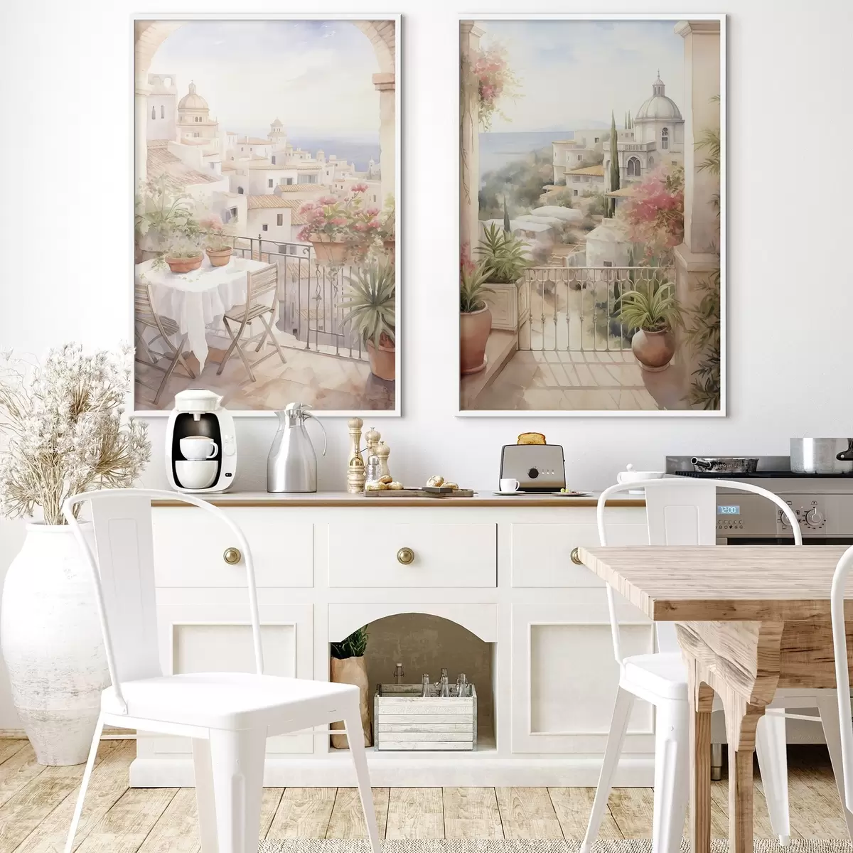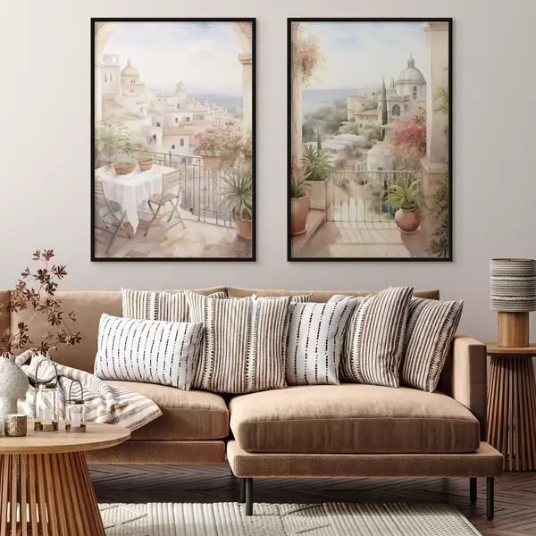 Affiche Coucher de soleil sur le balcon, architecture, fleurs épanouies, style aquarelle, méditerranéen d00420