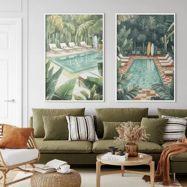 Affiche Piscine d'été, vintage, forêt tropicale, verdure, palmiers, style aquarelle d00422